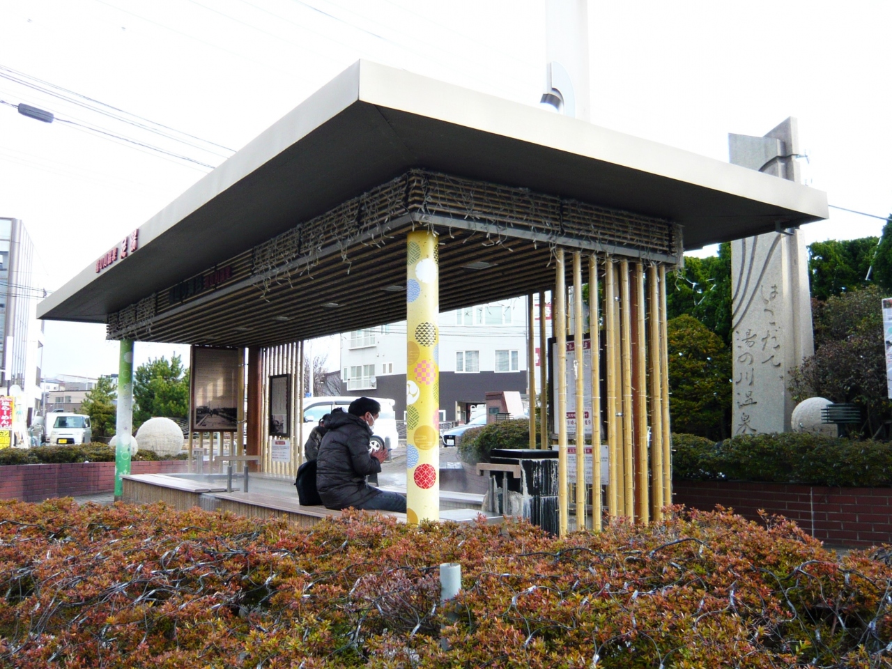 市電・湯の川温泉停留所で下車すれば交差点角で湯気が上がる「湯の川温泉足湯 夢巡り舞台」は一目瞭然の無料足湯施設です。