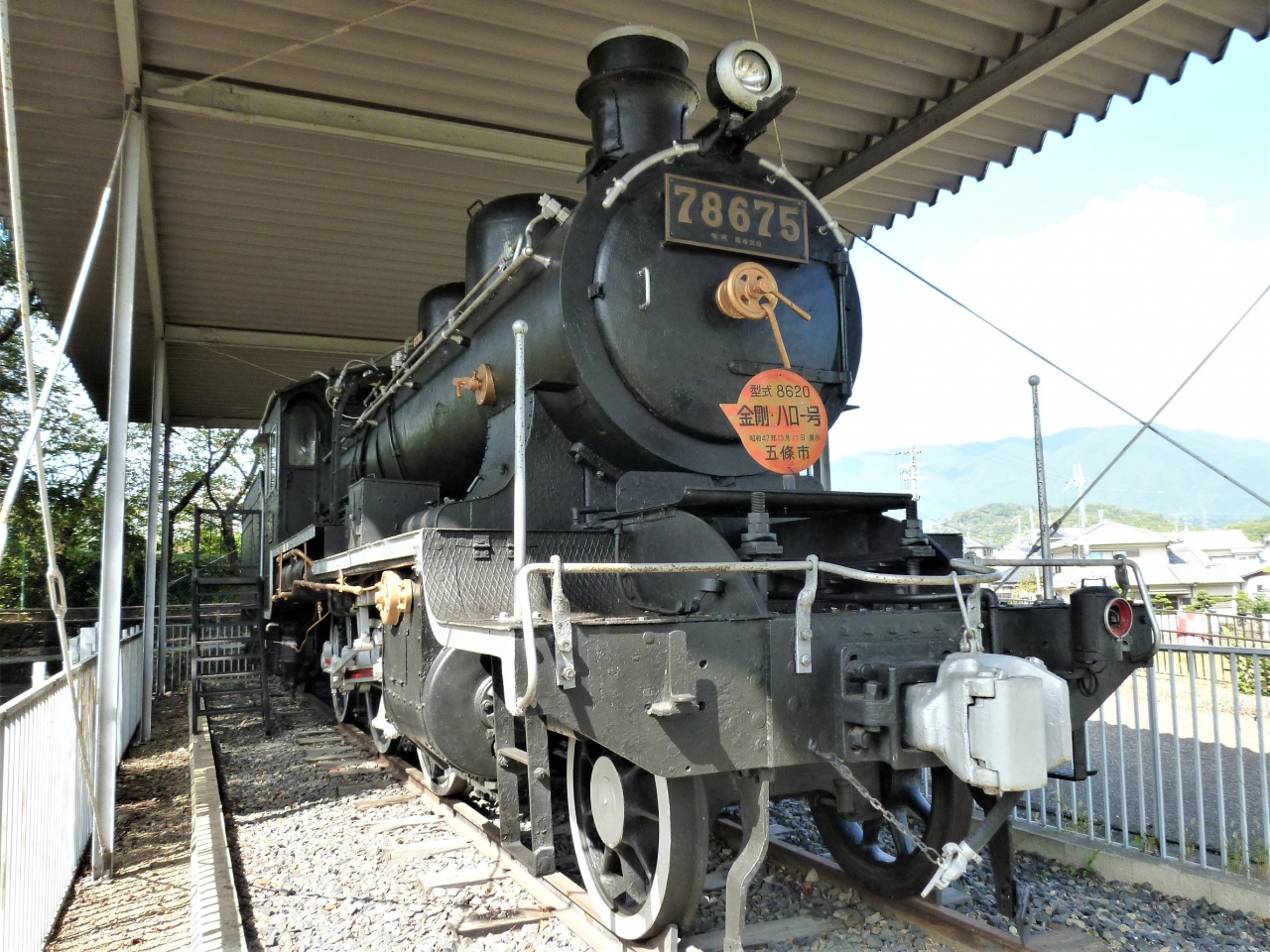 公園内には明治維新発祥の地の石碑が立ち、五條代官所跡長屋門が復元され、その内部には天誅組に関する資料館もあり、一角には屋根付きの8620形蒸気機関車が静態保存されてます。