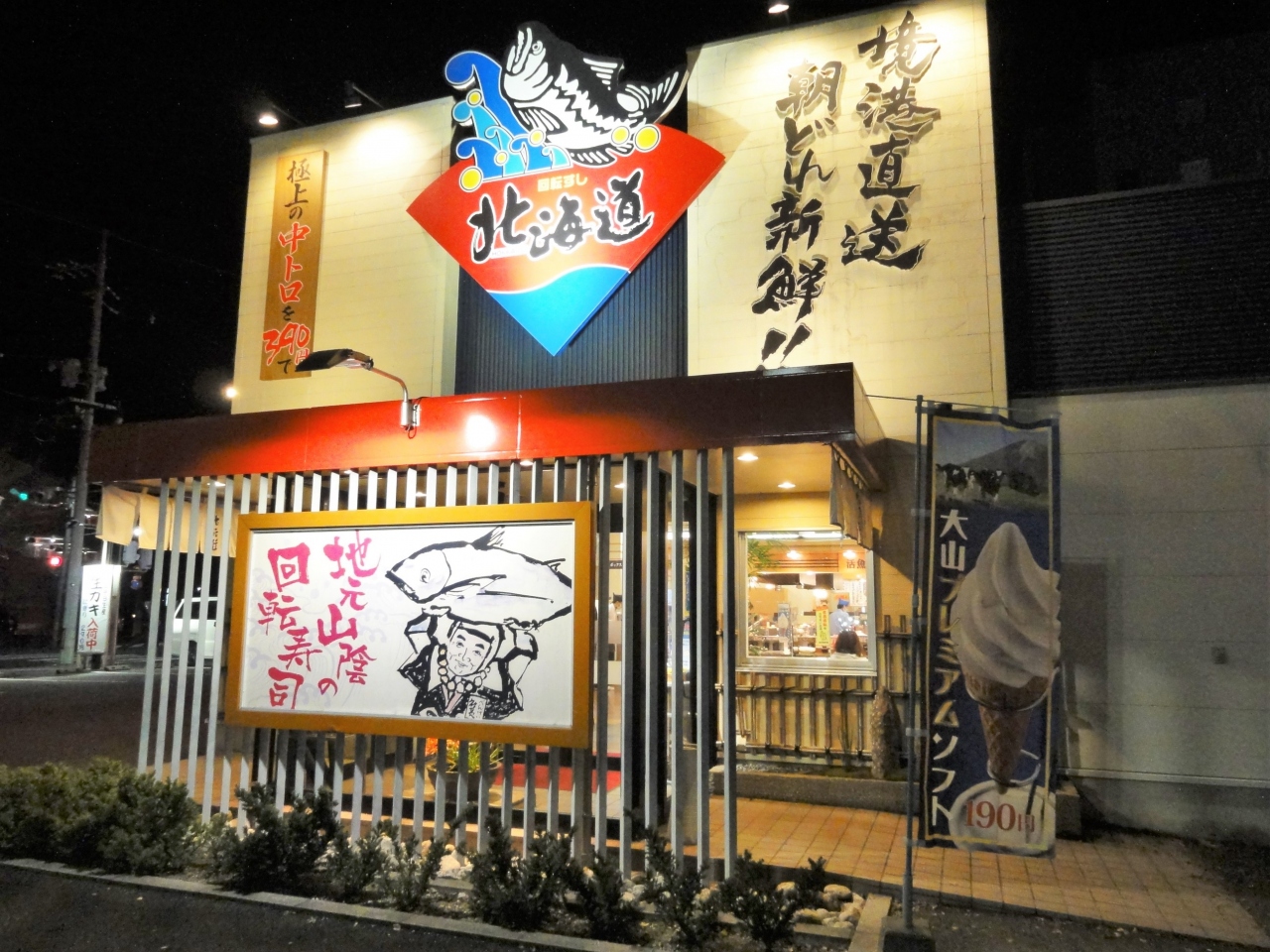 今回は必ず鳥取に来たなら回転すし北海道と決めてました!、前回は何故かインデアンレストランで美味しいカレーに出会ってしまったので、ホテルから徒歩で15分ほどの「回転すし北海道 駅南店」で夕食を頂きました。