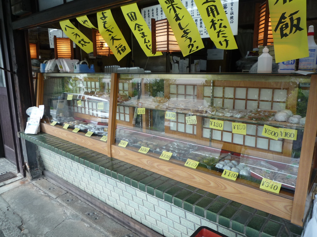 観るからに昭和を感じさせる白い生地にやきもちと記した暖簾~、大きなガラスケースの中に手作りのやきもちが並んだ静かな時間が流れてます。