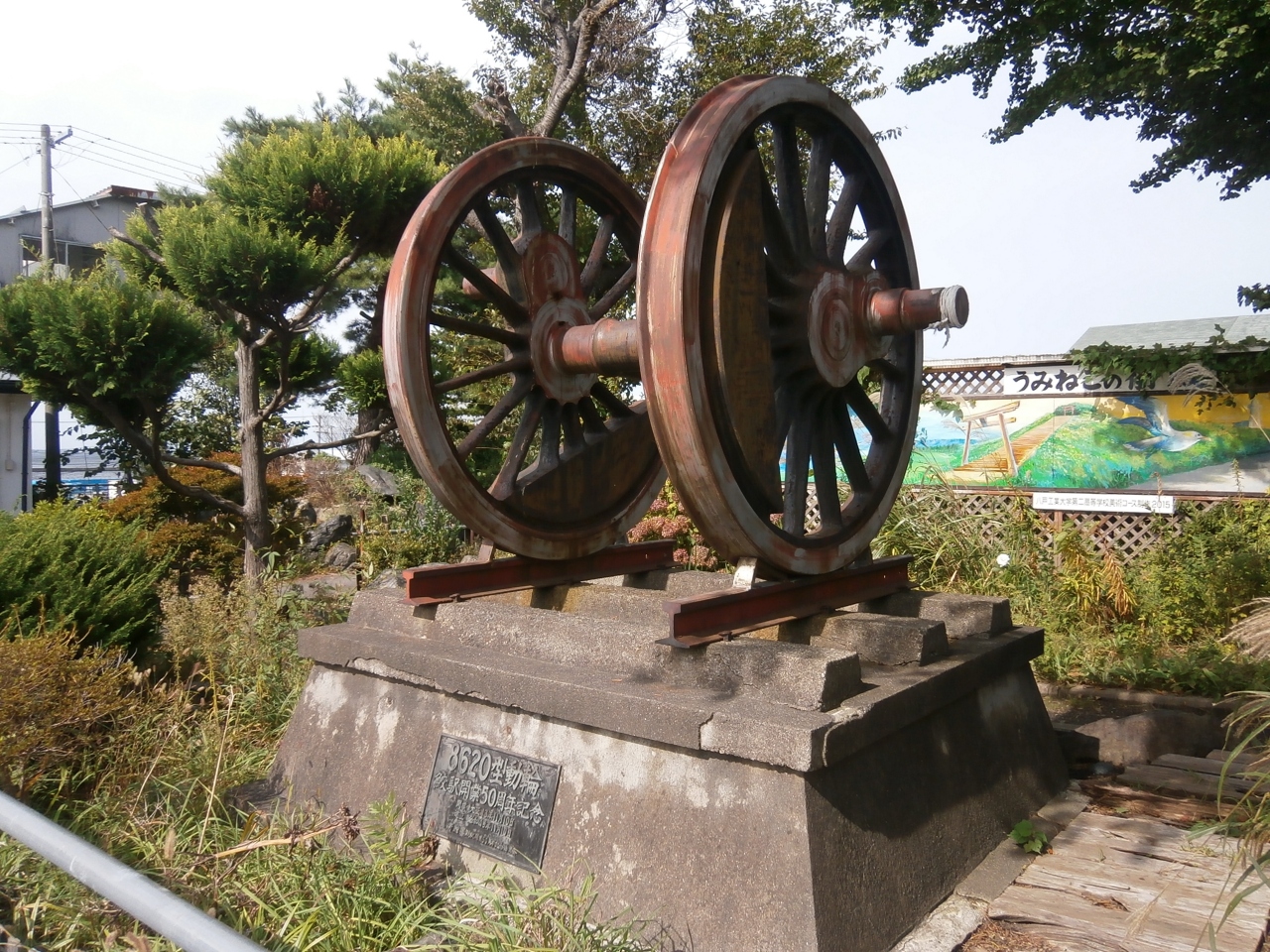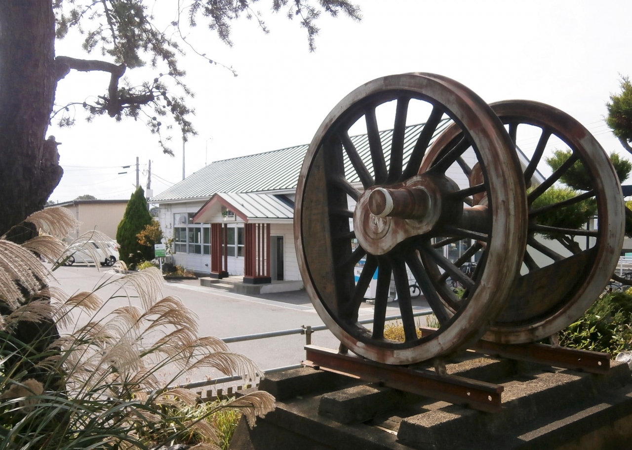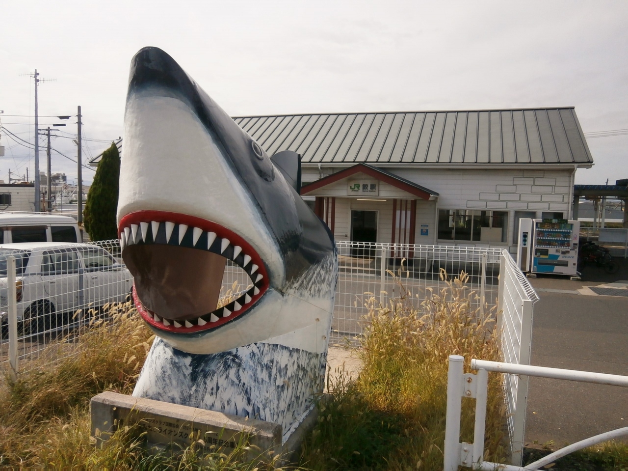 また、駅前広場には駅名に因んだ鮫の頭のオブジェがインパクトありで、顔出し記念撮影用として設置されていたり、開業50周年記念として8620形蒸気機関車の動輪メモリアルなども展示されてます。