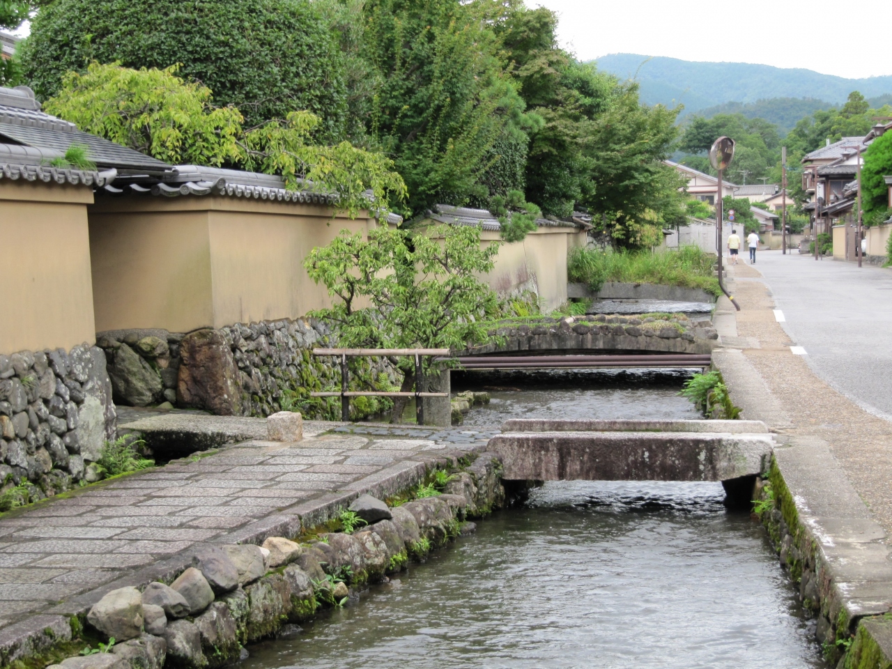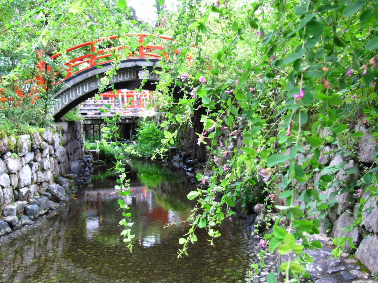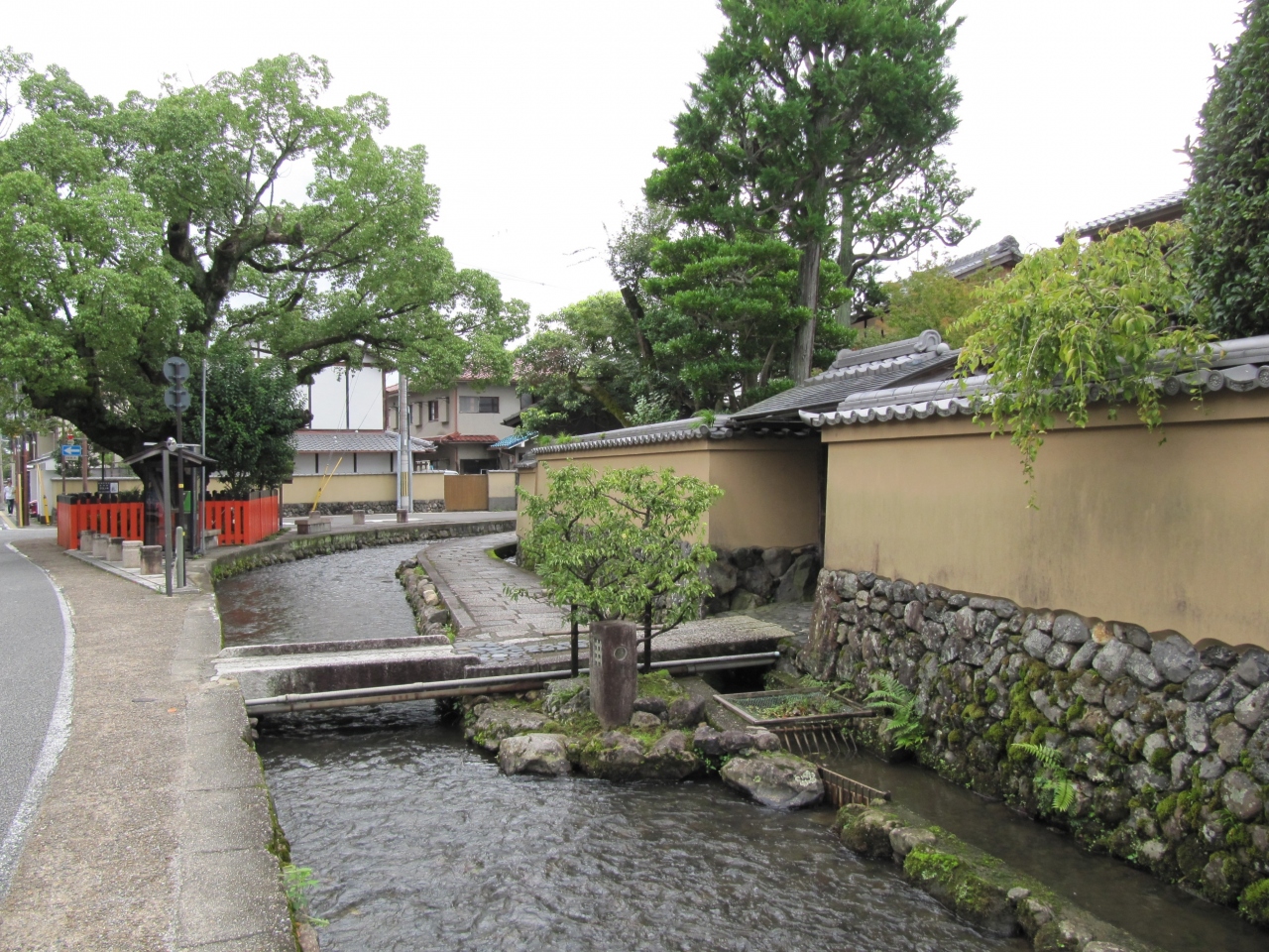 明神川の流れと共に掛けられた石橋やその石垣を覆い尽くす苔に生垣などが昔ながらの京の町の風情をもたらしています。