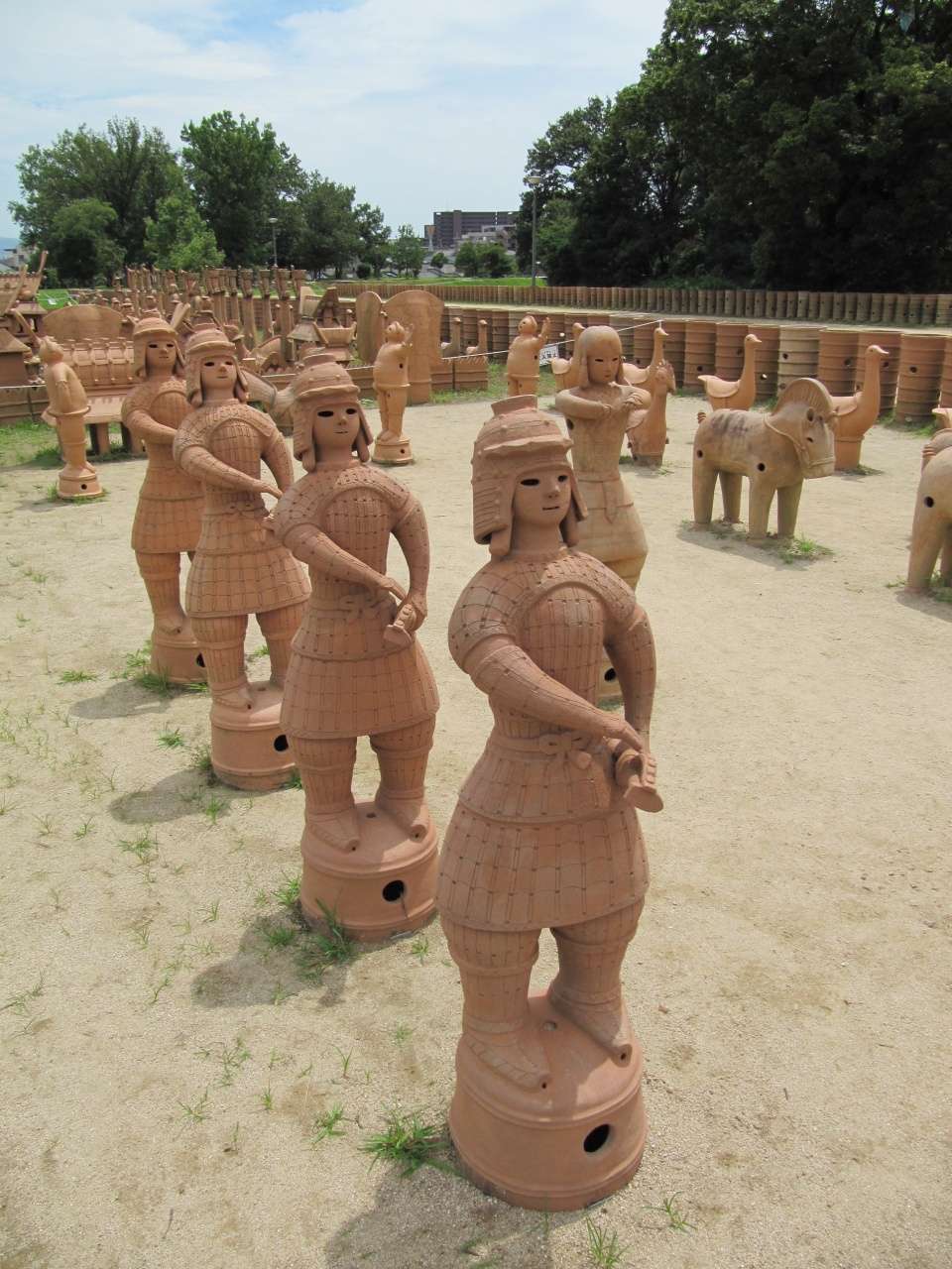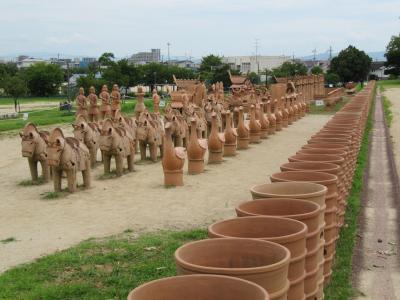 直ぐ側には発掘調査から出土した土師器や埴輪を展示解説した歴史館や、実際の今城塚古墳内に造られた祭祀場に並べられた多くの埴輪(レプリカ)達を観る・知る・触れることが可能な公園は貴重で、子供達が実際に埴輪に触れながら写真撮影をしたりと遊ぶ光景はここだけののもの~。