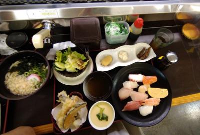 握り寿司御膳は握り寿司10貫・茶碗蒸し・かけうどん・ミニサラダ・天婦羅・付け合わせ2種とデザートのミニおはぎ。