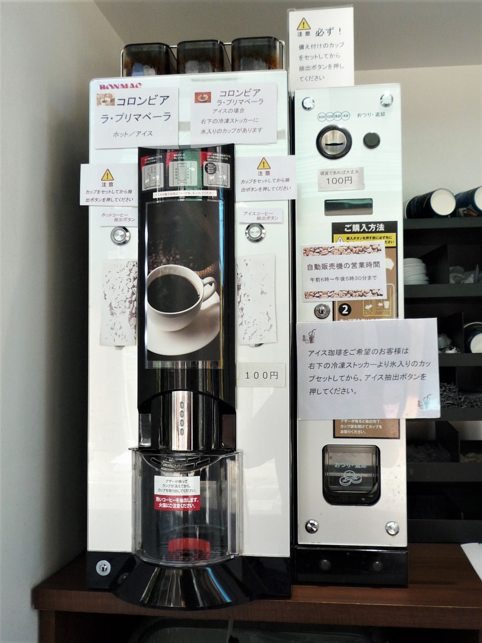 抽出するのは珈琲マシンですが、珈琲豆は店内と同じものなのでクオリティ―は凄い!、この日の珈琲豆はコロンビア・ラ・プリマベーラとあり、普段飲んでいるコンビニコーヒーとは格段に違いが判るものでした(若干量的には少ないですが?)。