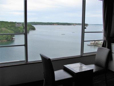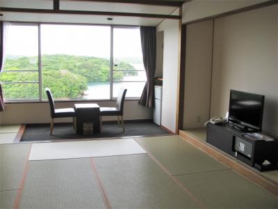 部屋は海側・和室12畳なので大人4名でも十分にゆったり~、大きなガラス越しに陽が入り明るく英虞湾の入り江が素晴らしい眺めです。