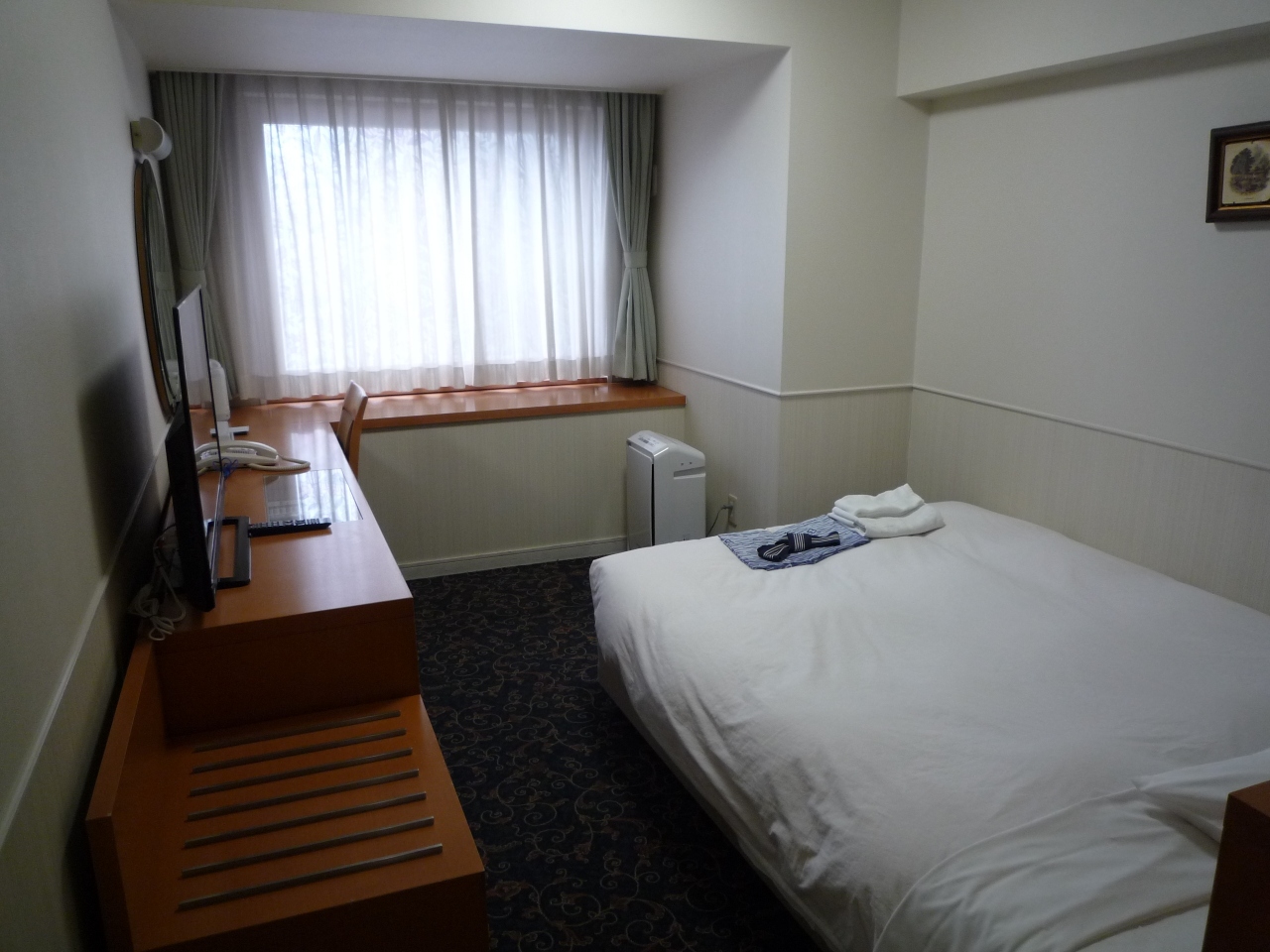 予約は禁煙シングルC・西館で、白を基調としたゆったりとした部屋には加湿空気清浄器から大型TVに140CMサイズのベッドも余裕、荷台も有りました。