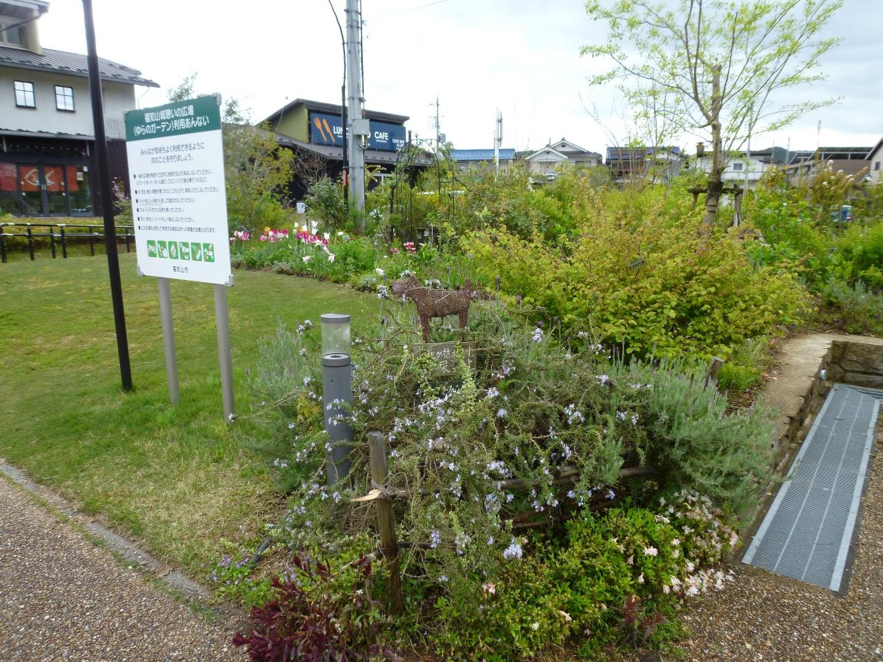 福知山城公園の前に出来た「ゆらのガーデン」はナチュラルガーデンを模した洋風庭園に商業施設を加えた新しいタイプの観光施設で、駐車場も無料でゆったりと70台が止められるように確保されてます(トイレも有り)。