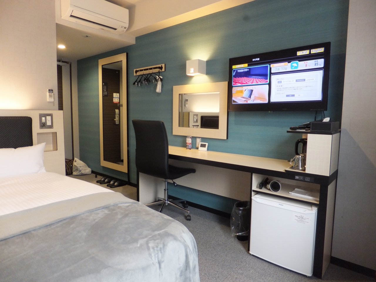 部屋の広さは普通でシンプルながらデザイナーズホテルのように今風の雰囲気です~、特にベッドサイズ(140cm)や使い勝手の好い荷台、しっかりとしたホールディングチェアー、加湿空気清浄器に遮光カーテンなど必要なものは揃ってます。