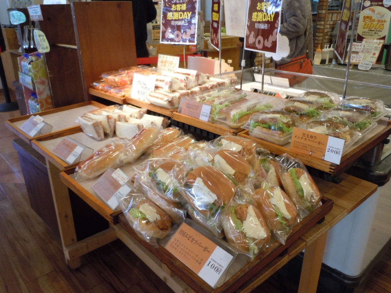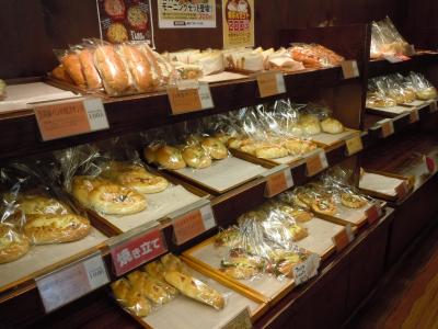 店はこじんまりとした明るい店内にお昼時もあって大勢の客がパンを買い求めていました~、棚にはいっぱいの焼き立てのパンが並べられて、食パン・菓子パン・総菜パンにサンドイッチにドーナッツ、隅には自慢のコロッケやフライドチキンまで有る品揃えの充実ぶりは凄い!。