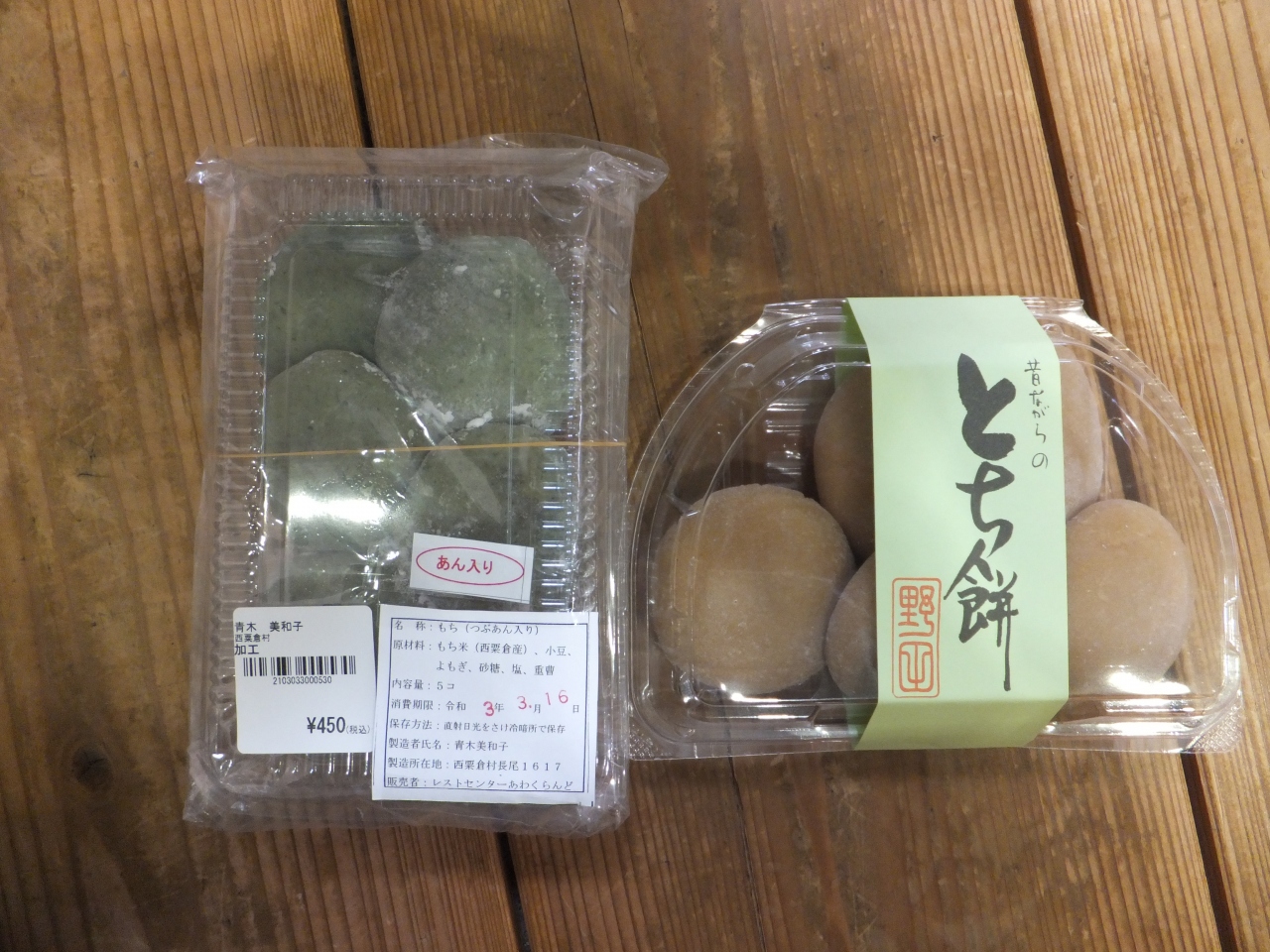 また、地元の婆ちゃん達が手作りする大福餅やヨモギ餅に団子なども人気で、これが本当に旨くてつい買ってしまいます~、この日はヨモギ餅に栃餅を見つけました。