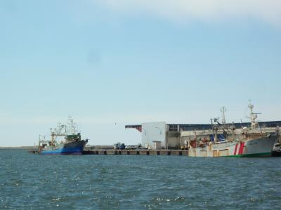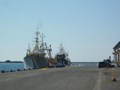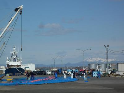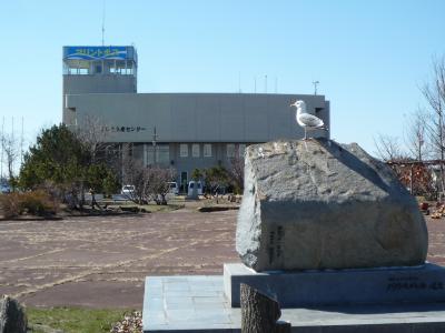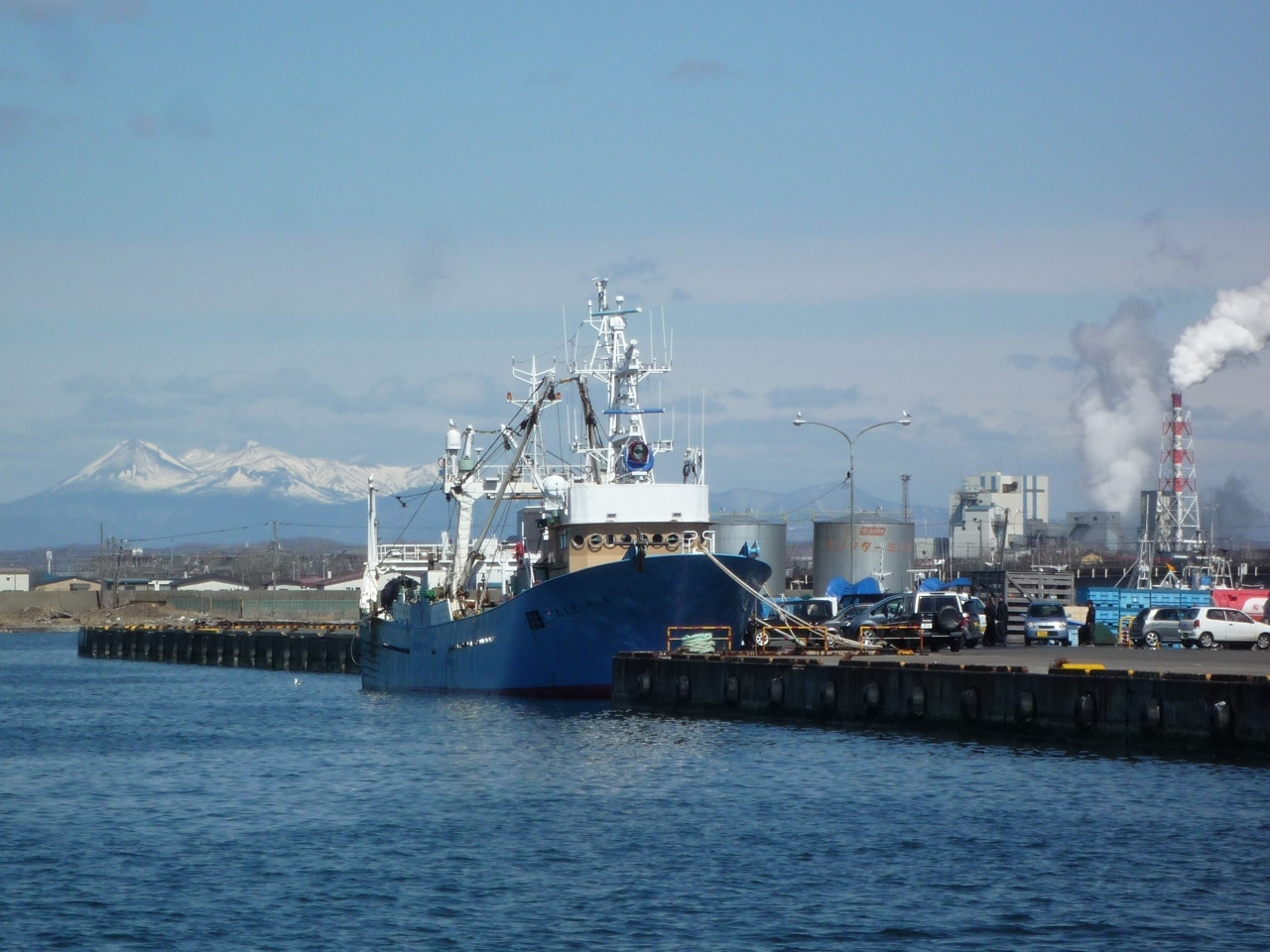 この季節はオフシーズンなので漁港の光景も穏やかです~、岸壁を歩いても風に吹かれることも無く静かで聞こえてくるのはカモメの鳴き声ぐらい…、天気が好いと背景に残雪が残る阿寒岳連峰が観えます。