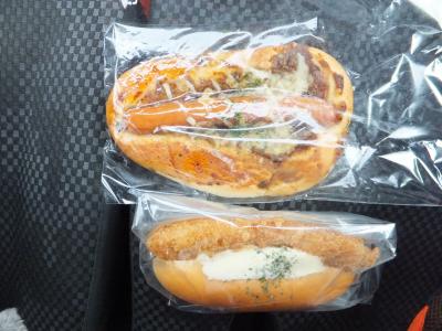しかもどれも美味しそうに見えるから堪らない!、これでは自然と財布のひもが緩んでしまう…、色々と迷ってあげく目に止まったのがWクリームコッペパン・粗挽きソーセージカレーパン・白身フライサンド・本格カレーパンと自慢のコロッケにフライドチキンを購入。