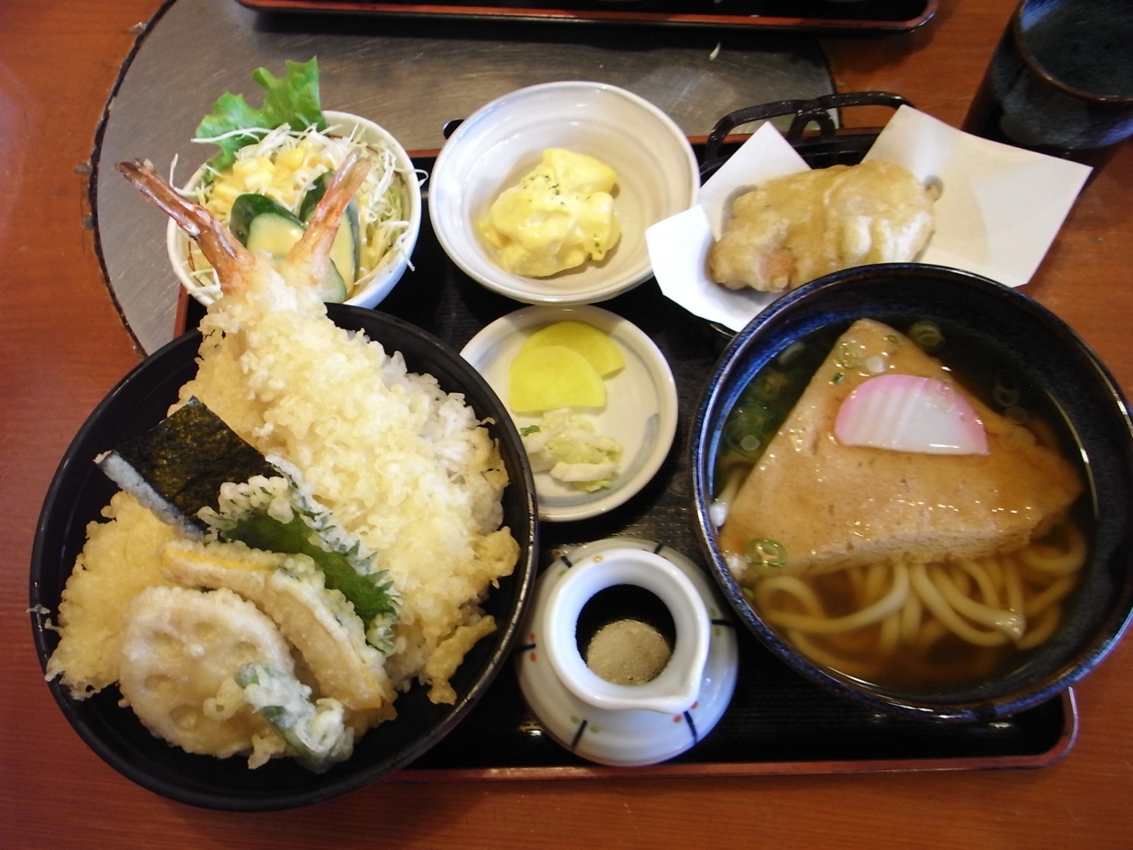 天丼は申分のない大きな海老天が2尾に獅子唐・さつま芋・かぼちゃ・大葉・海苔・蓮根の天婦羅とやや控えめ丼露が好い!、麺類はきつね饂飩ですが~、腰と艶のある讃岐の麺にカツオと昆布の出汁が効いた風味が大阪饂飩の味が本当に旨くて…、しかも揚げの炊き方味付けも良くて久しぶりに旨い饂飩に出会った感じでした。