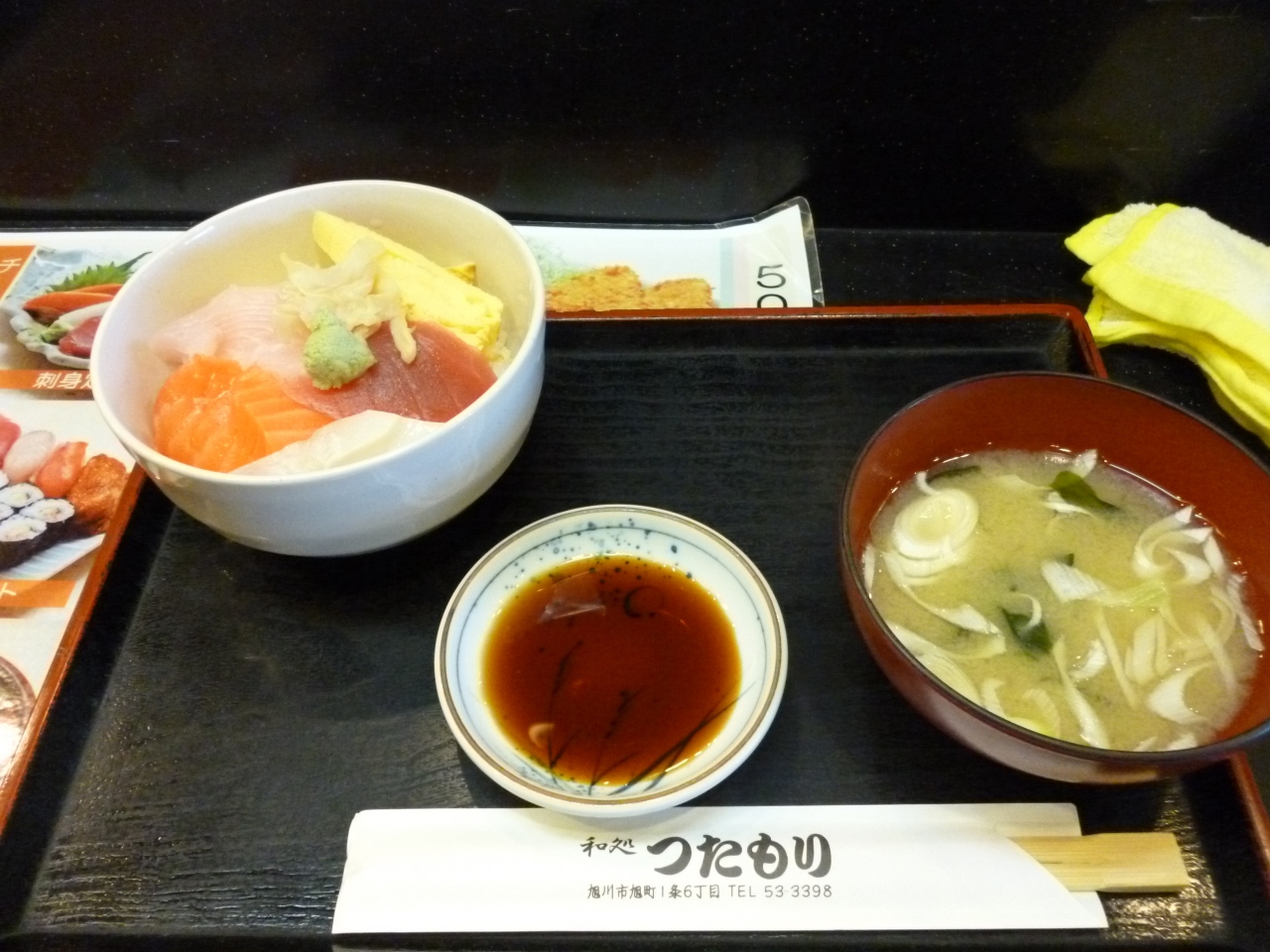 早速、¥500ランチメニューが渡され少しは変わっていましたがつかさず海鮮丼を注文、その海鮮丼は小ぶりの丼にマグロ・サーモン・ひかりものの3種類ネタに玉子焼きのみ?…、ネタも冷凍物に〆たもので質も鮮度も良いとはいえないもの…、これに吸い物ではなく味噌汁とは?…、いくらなんでもこれは酷いと感じました。