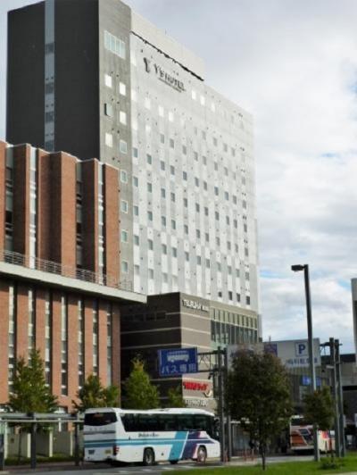 JR旭川駅前にに建つ比較的新しいホテルのようで~、1階にはバス案内所やツルハドラッグに高級食パン乃が美が在ります。