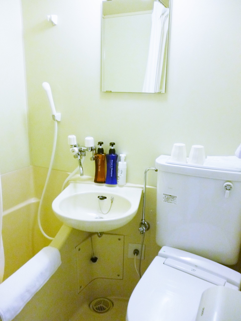 トイレは通常のシャワートイレ付きでバスルームもシャワーも含めてありません。これは自慢の天然温泉大浴場が備えられているので不要の為、エコノミーシングルにしました(それ以外の部屋には付いています)。