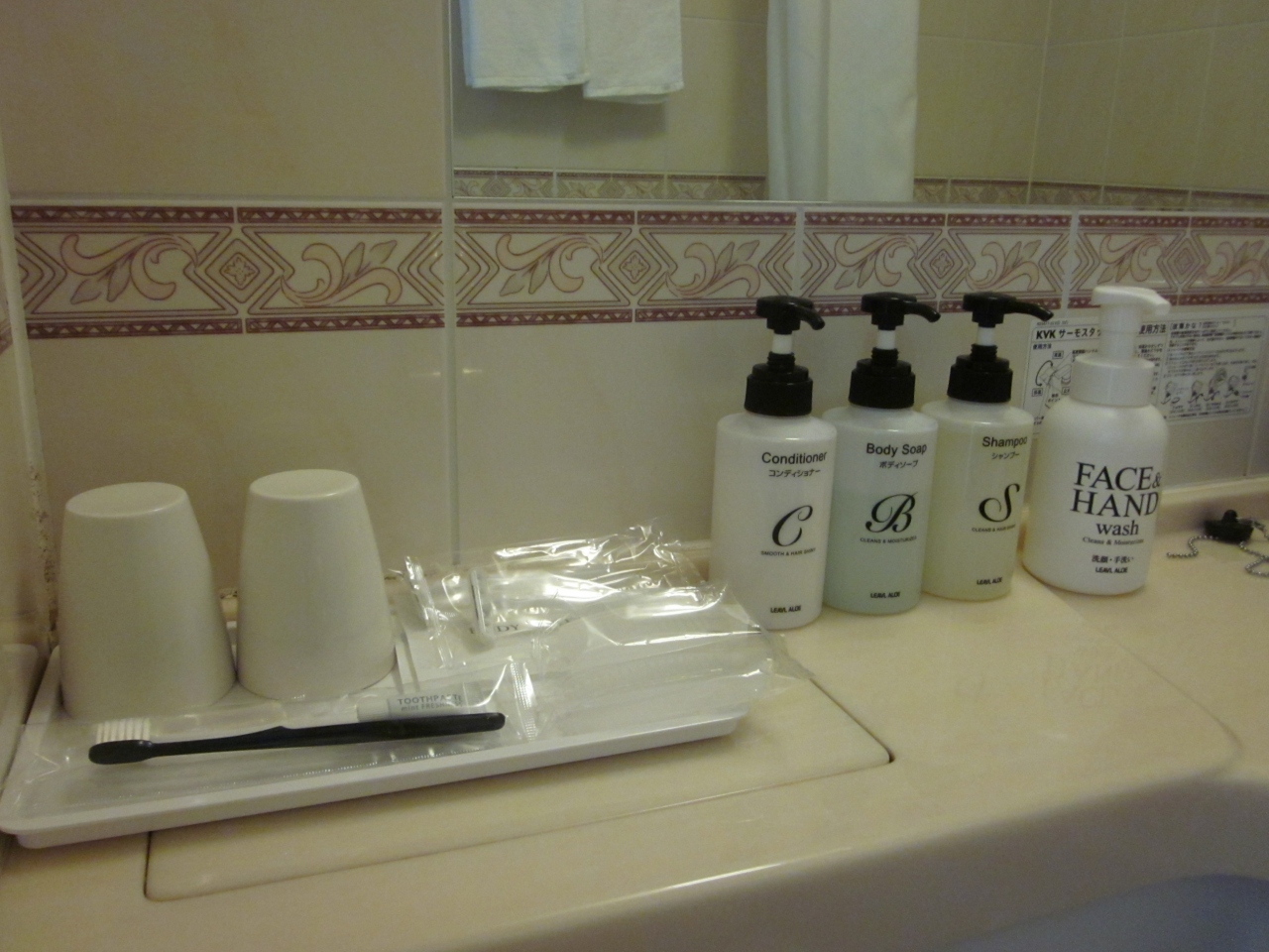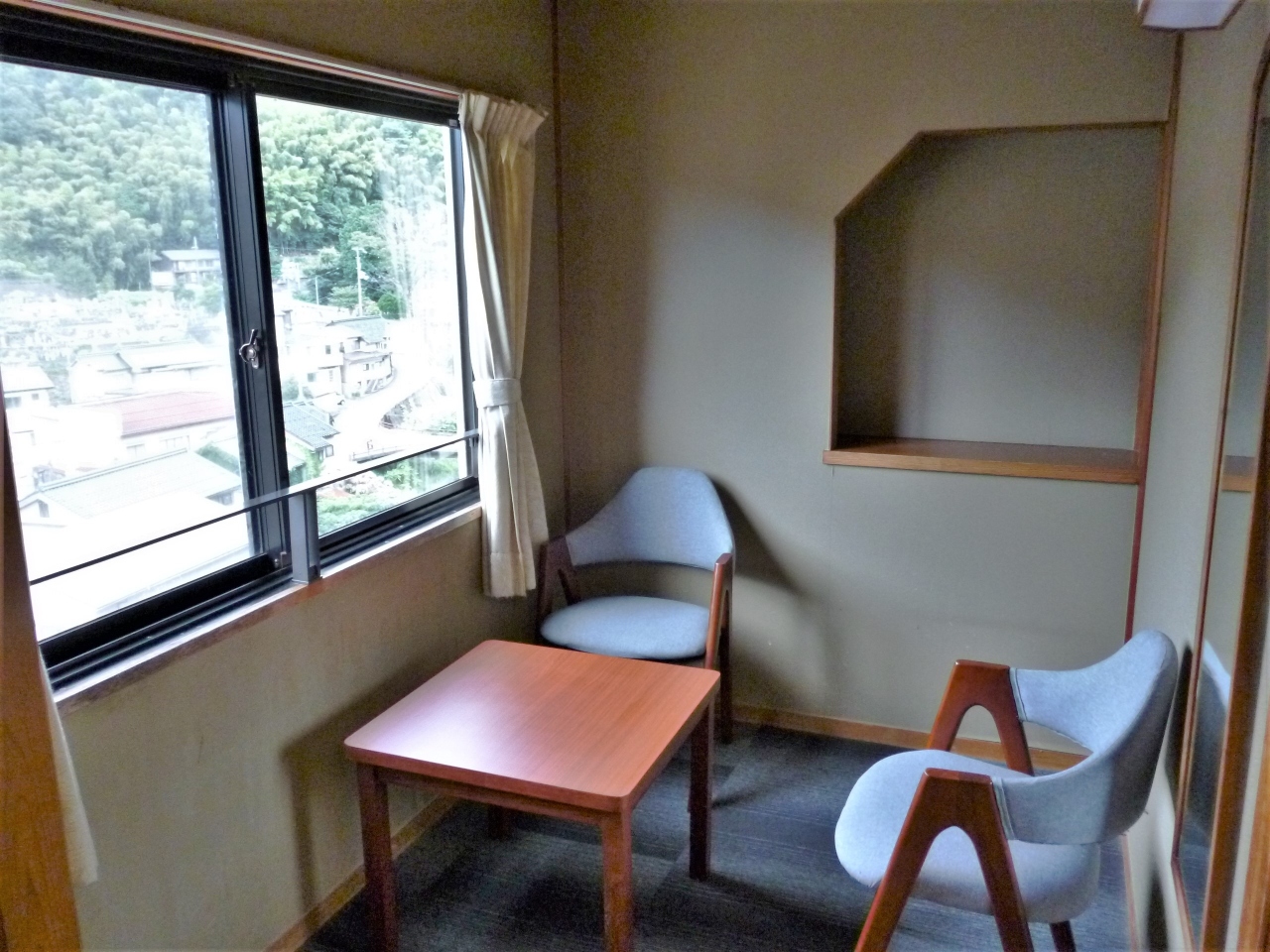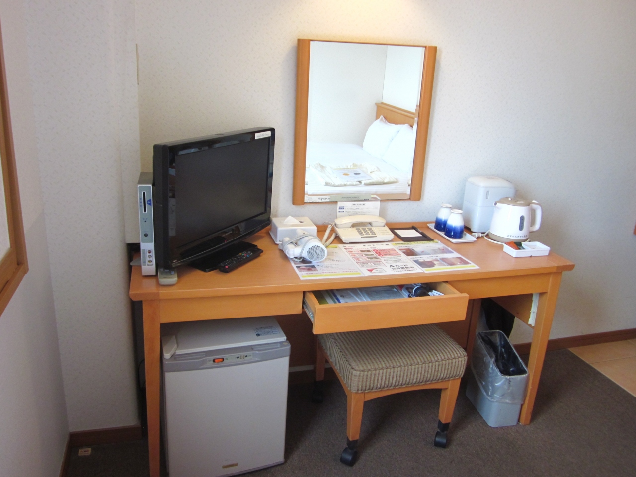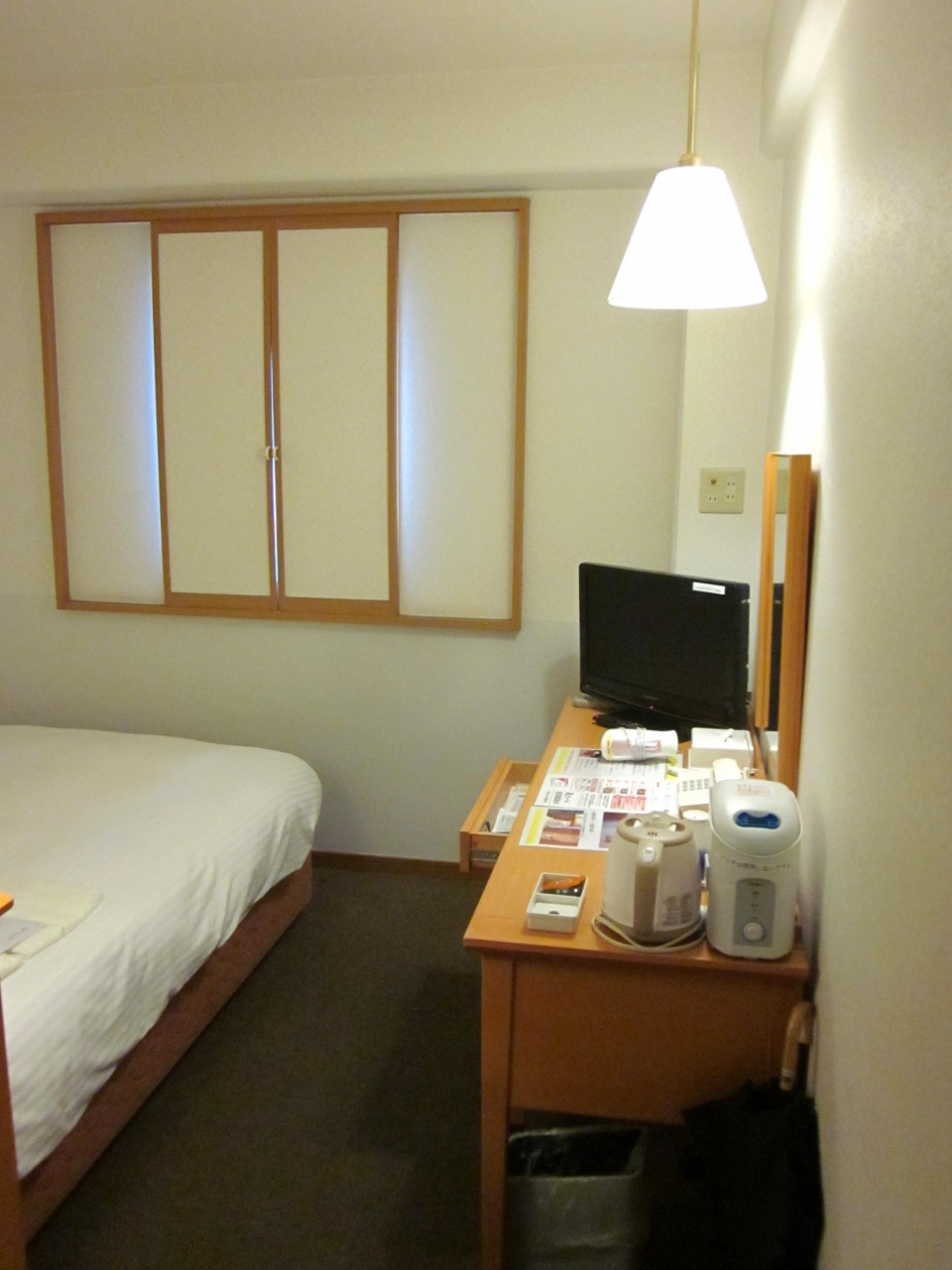 備品やアメニテイーも揃っているので不自由も無し~、強いて言えばTVが小さい、冷蔵庫が冷えない、窓がカーテンでは無く障子タイプの為に朝は光が漏れて入るなどです~。