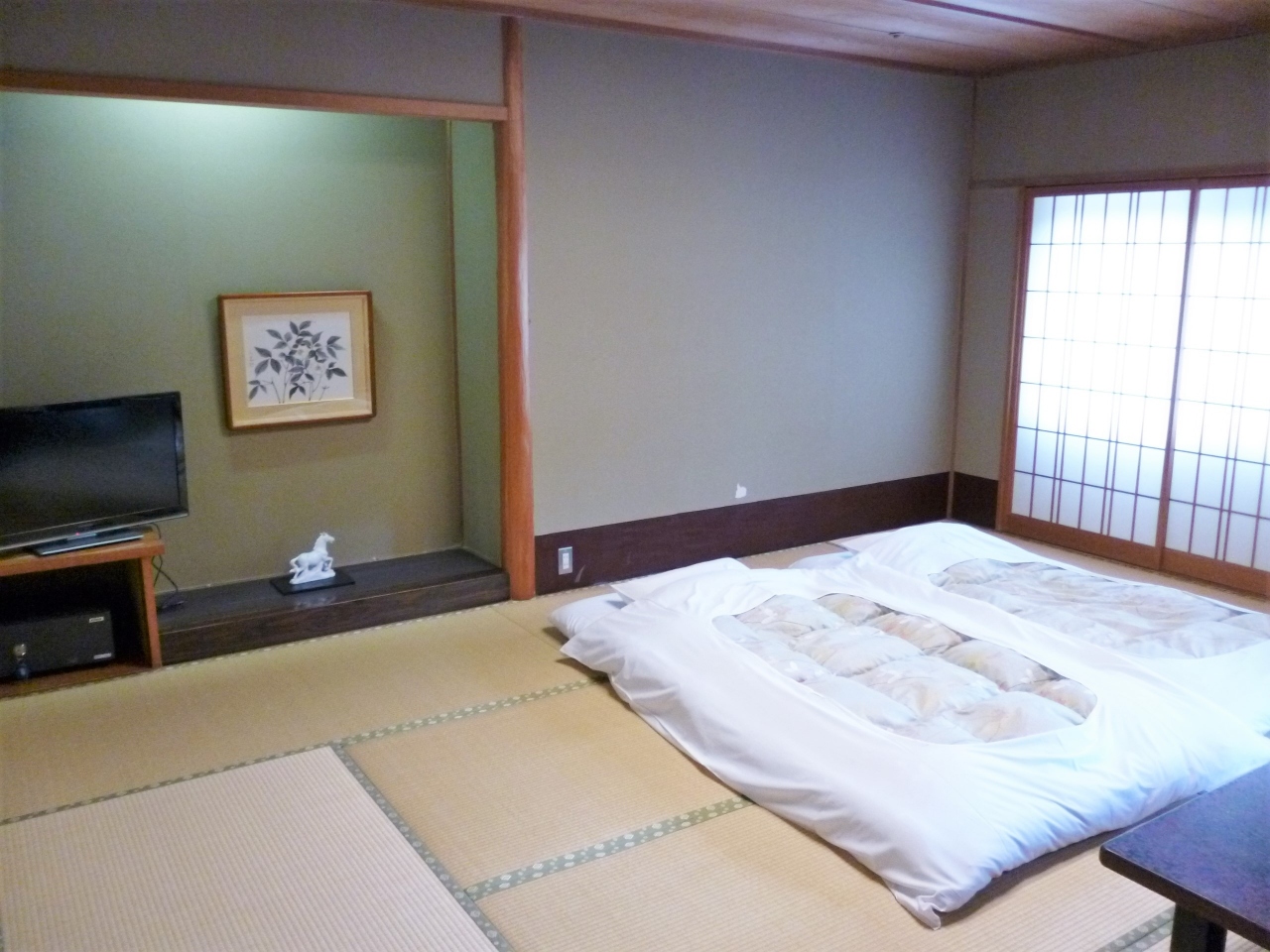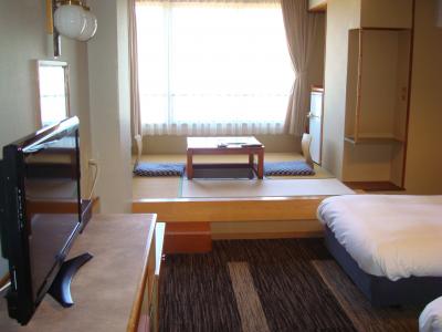 今回の客室は禁煙・洋室リバーサイドビューのツインベッドルームですが、窓側に4畳ほどの和室(堀タイプ)が付いているのですが意外にも使い勝手が悪くて、これなら普通の応接セットの方がまだましなのですが?~。