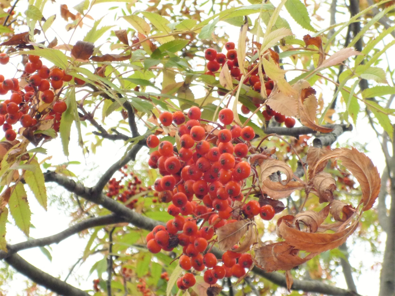 秋本番の紅葉には少し早いですが、それでも色付く木々の葉の色や落ち葉にナナカマドの赤い実は秋の訪れを物語っていますね…。