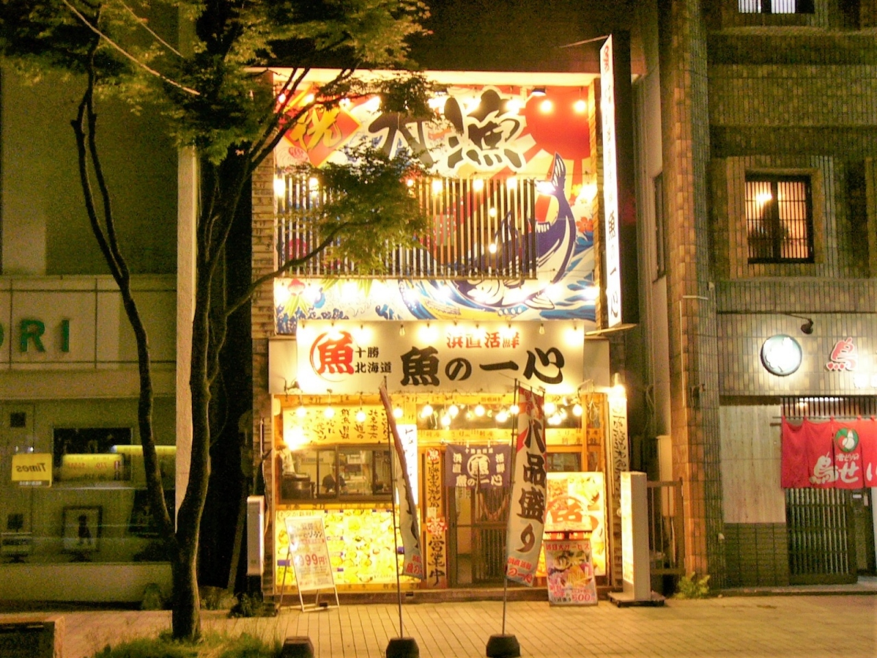 西1条通り沿いで駄派手な電飾の居酒屋として人気があるらしい「魚の一心」、店頭に立て掛けた”本日の大サービスお刺身8品盛¥500”は目を引きますね!…、そのキャッチコピーが頭の中から抜かなくて、誘われるままに入ってしまいました。