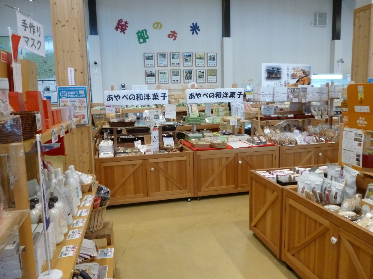 館内は地元綾部に由来の在る生産者の野菜から食品の加工品に地元土産品、手工芸品から綾部が生んだ地元企業のグンゼの肌着に至るまで展示販売してます。