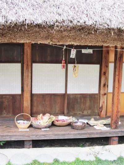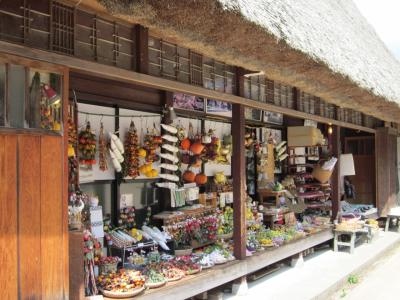 菅沼集落の中ほどに在る「土産・お休み処あらい」も合掌造りを活かした縁側一面に手作りの土産物を所狭しといっぱい並べて置いてます。