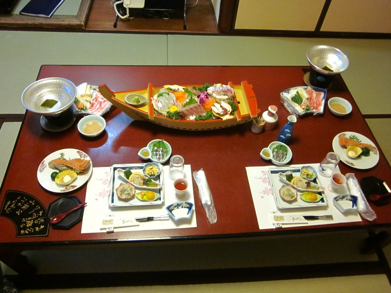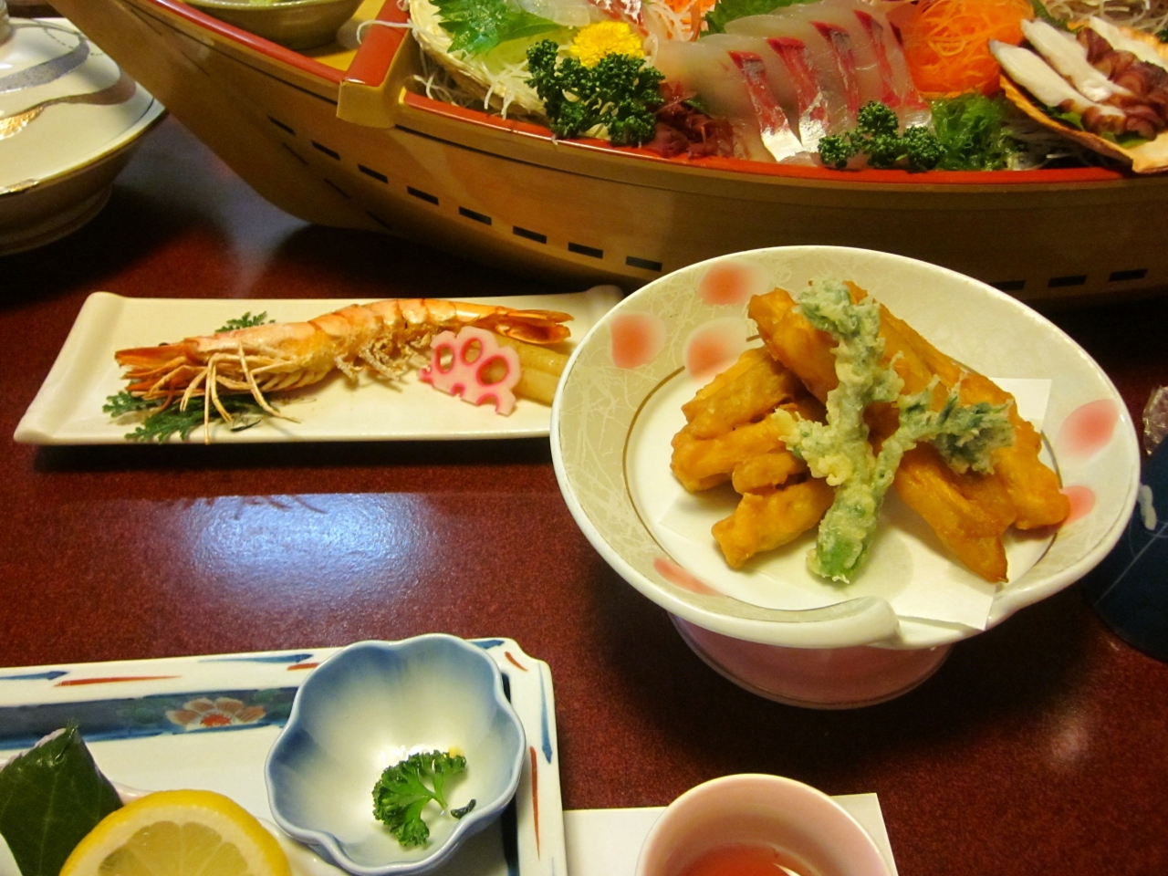 夕食は部屋食でゆっくりと天草会席をいただけますが、一度に運ばれて来るので天婦羅や焼き物は冷えてちょっと残念です?…、