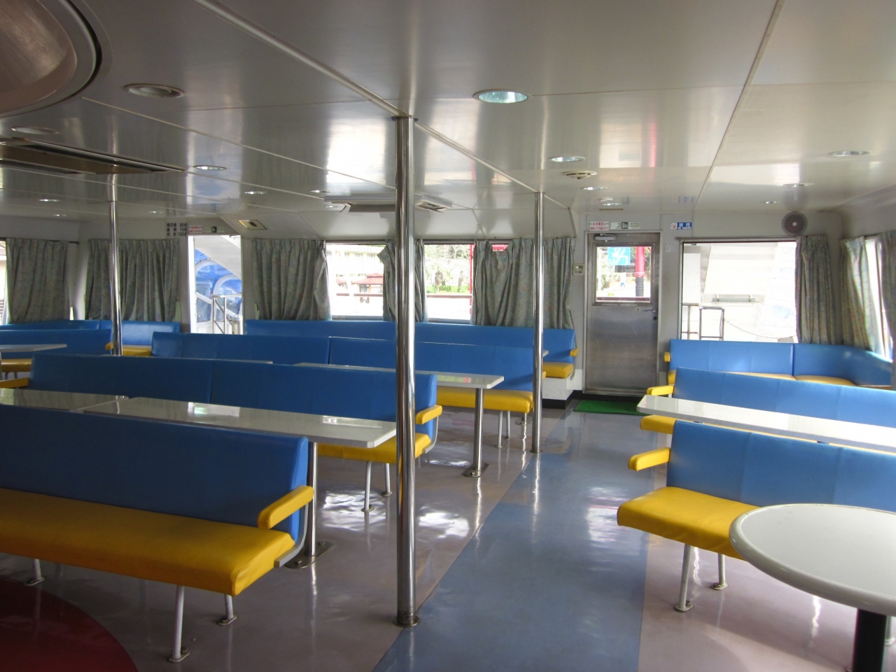 船内へは車両甲板から階段のみで、ご高齢の方には厳しいかも?…、2階の客室は至ってシンプルな長いベンチの椅子が真ん中から船首に向かって別れています。