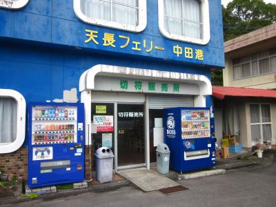 道路脇が広い待機場なので道路に描かれた行先に分かれたレーンに停車(長島へは諸浦港)、乗船券の購入は車検証を持って青い建物の天長フェリー中田港切符販売所の窓口で、車4m未満1台と大人1名で¥2490(車¥2080+人¥410)、支払いは現金のみオンリーです!。