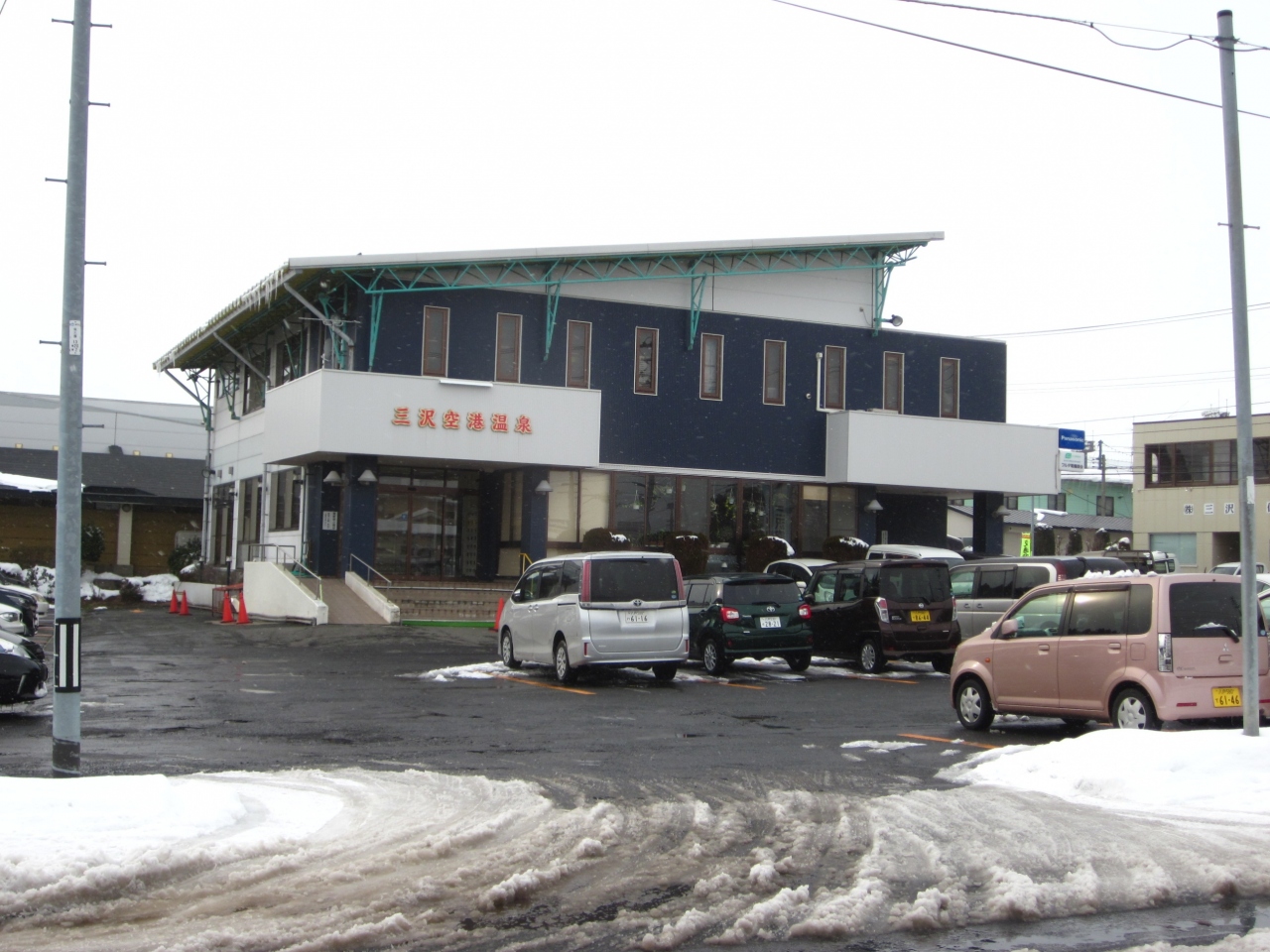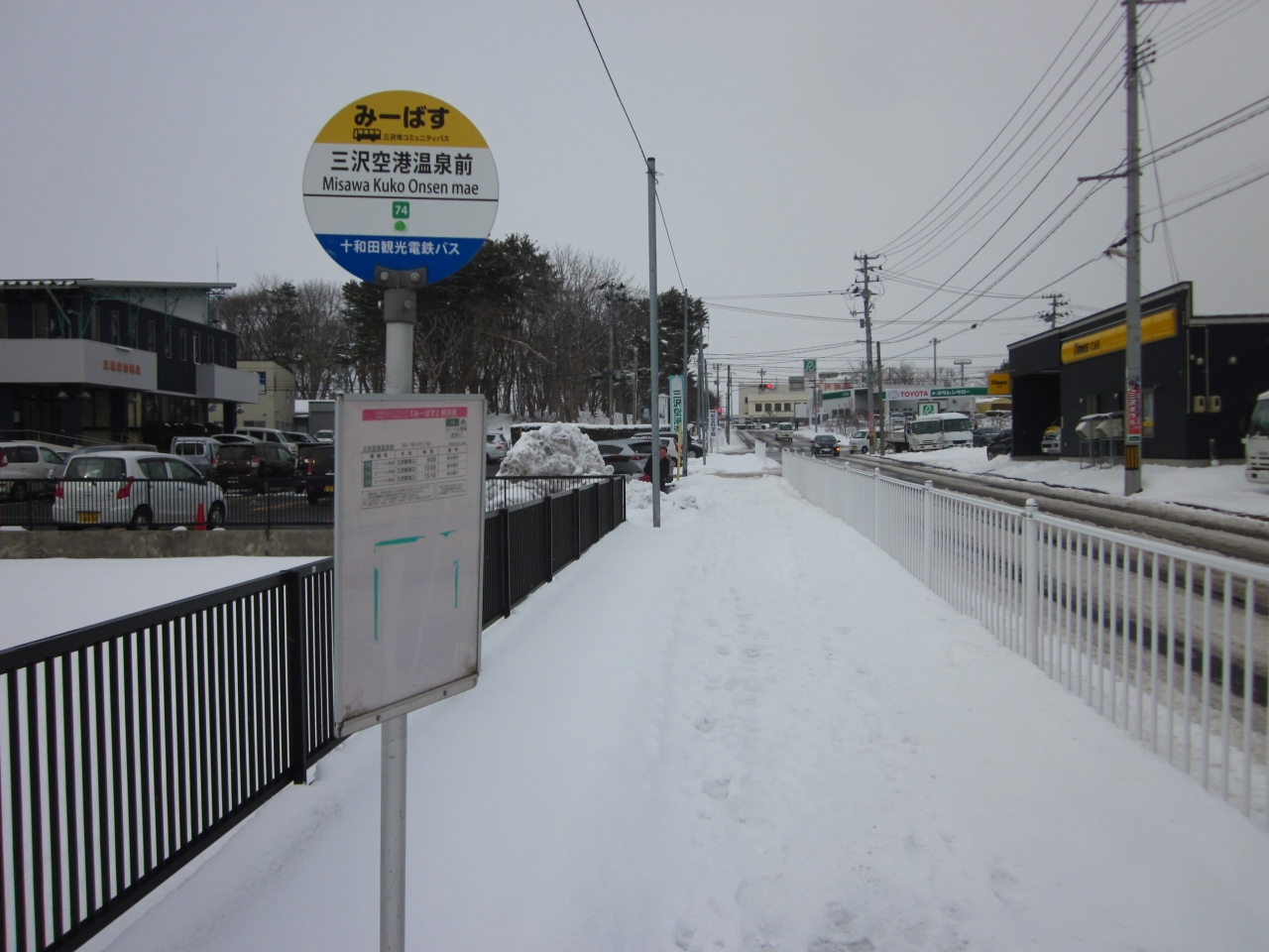 で三沢観光協会にパンフレット送付を依頼した際に、三沢空港温泉という日帰り温泉施設が在ることを発見!、まさに名の通り空港から徒歩で数百メートルの近さで、通りには「みーばす」のバス停が在ることが判りました。