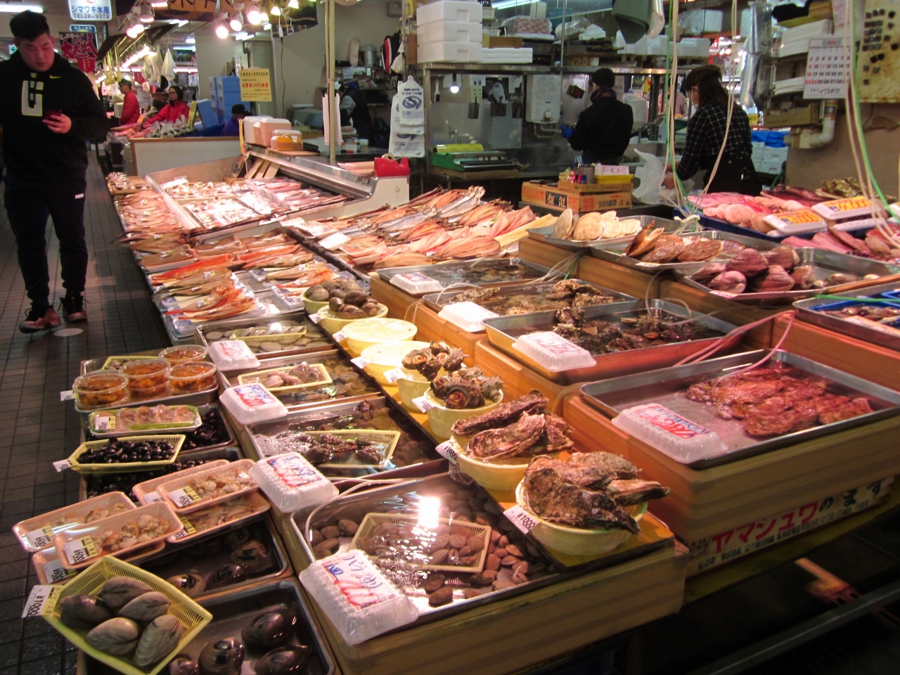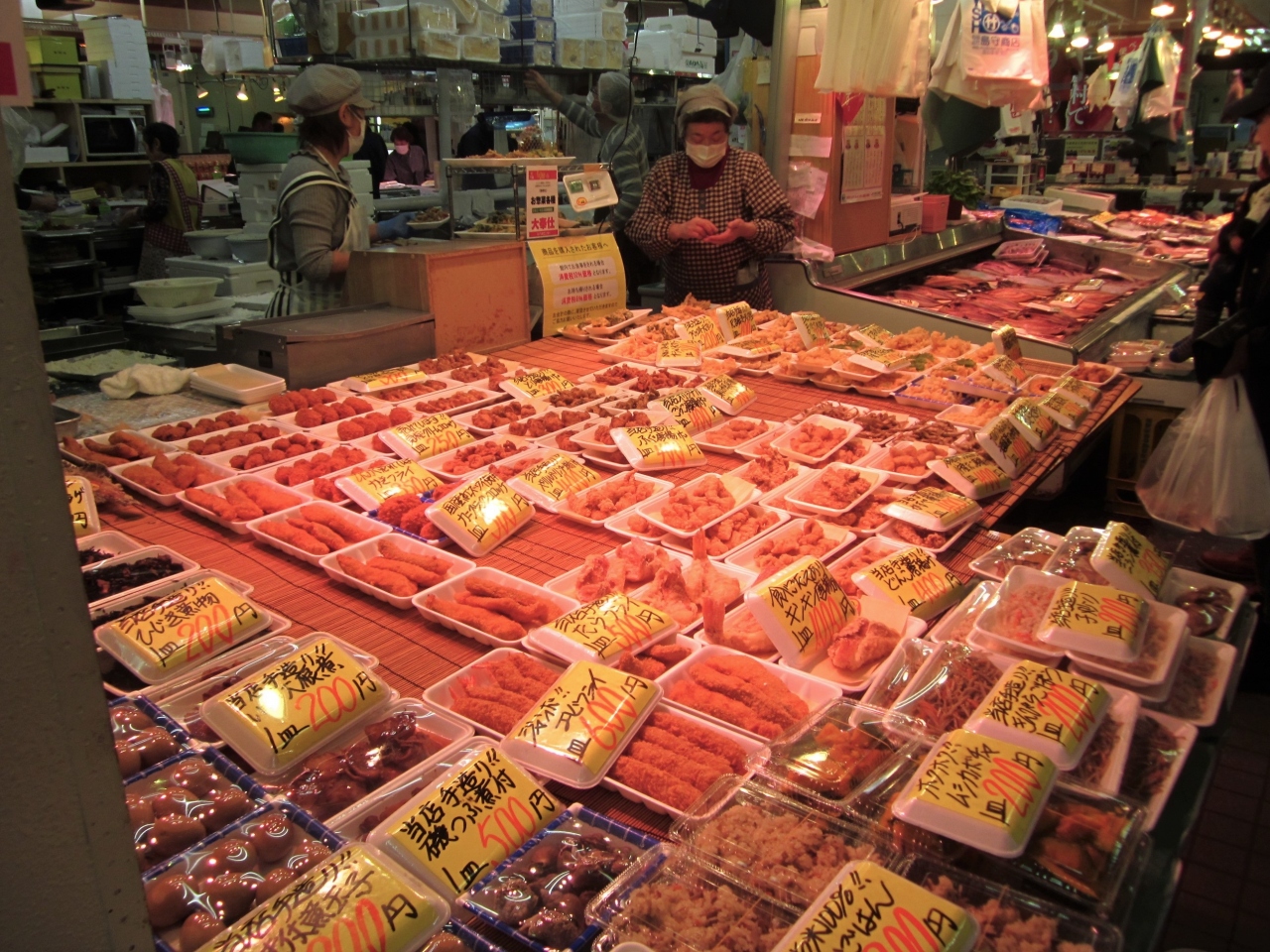 総菜なんかは確かに安くてボリュームもあってお買い得なんですが、魚介類はどうみても質は好くても高いですね?~、陸奥湊の市場と比べれば一目瞭然だと思いました。