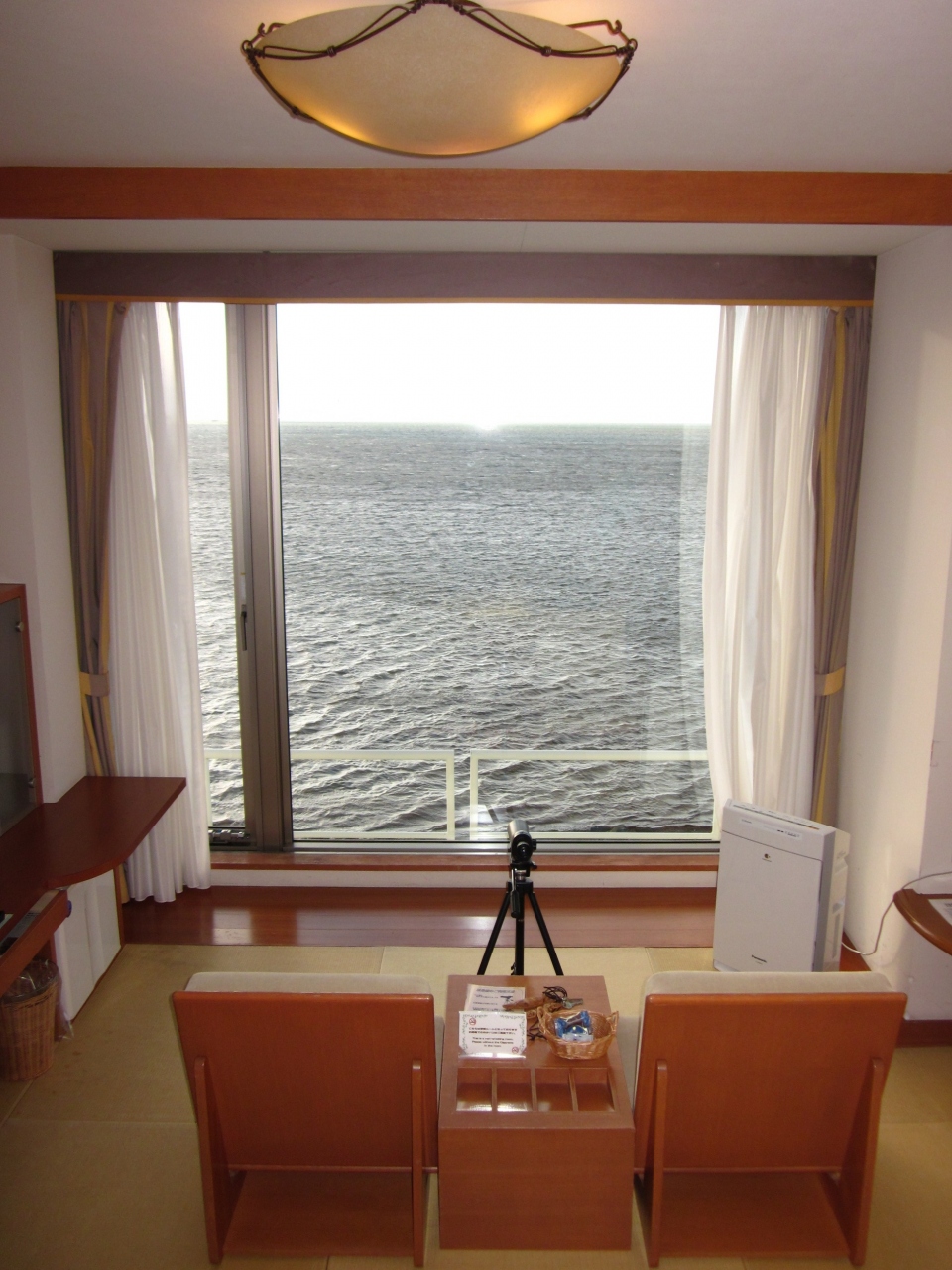 部屋に案内されると大きな窓越しにサロマ湖が雄大で一望~、何と言う素晴しいロケーションでしょうか?~、望遠鏡まで揃えてあるこの気遣いは流石です!。