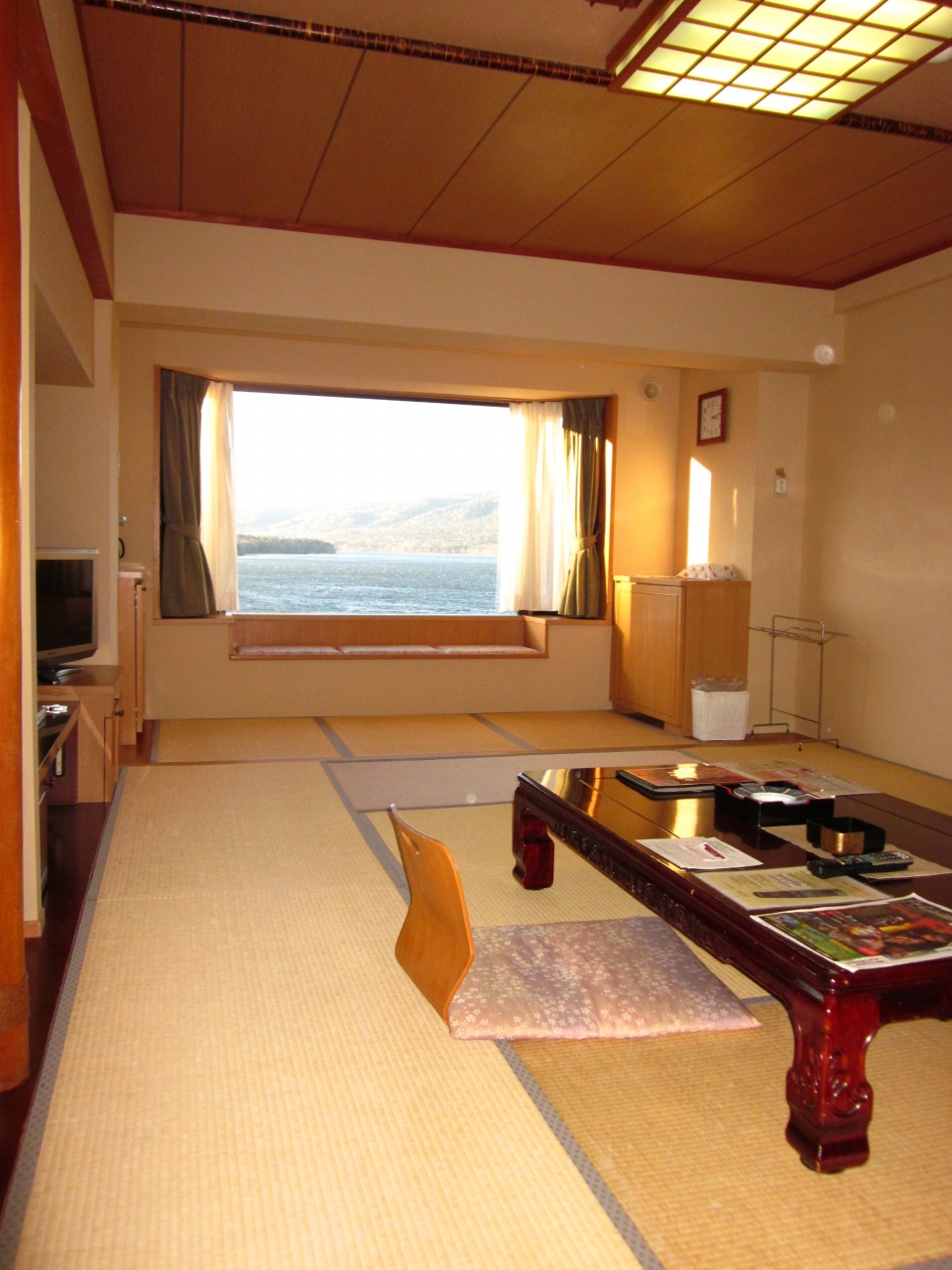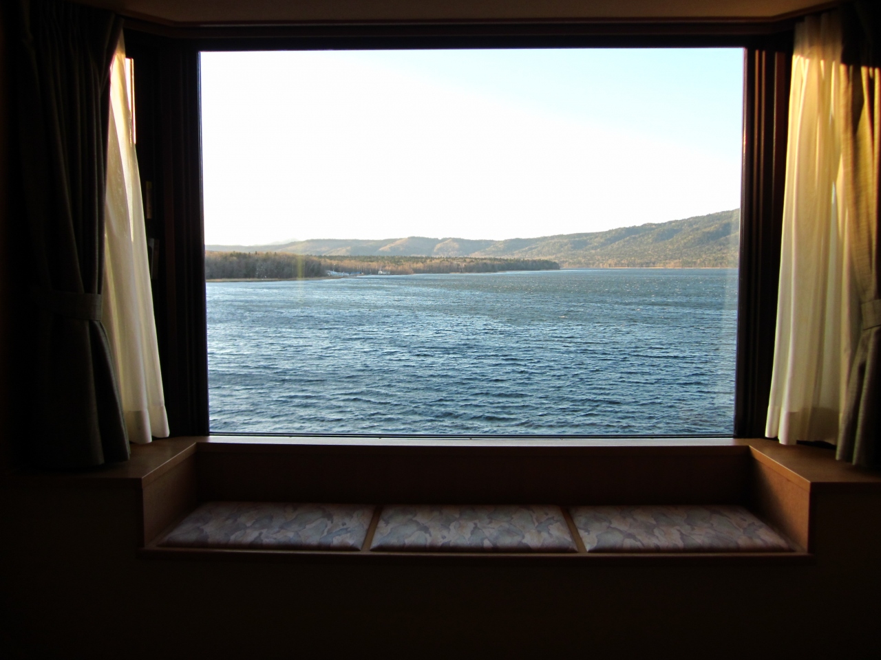 部屋は湖畔の景色が飛び込んで来るような広い出窓の12畳~、一部リニューアルされて街側部屋よりは広くて快適かな~?。