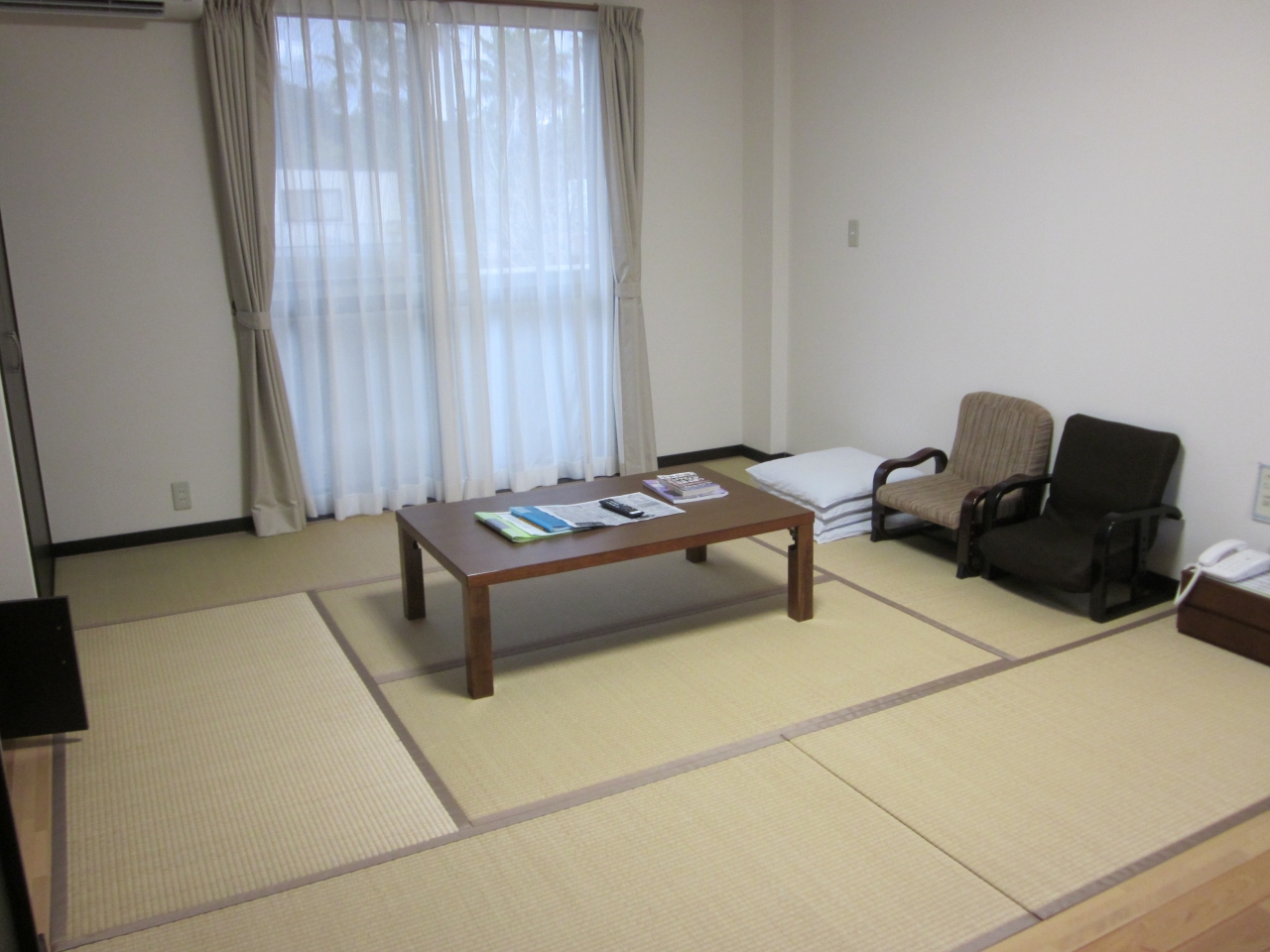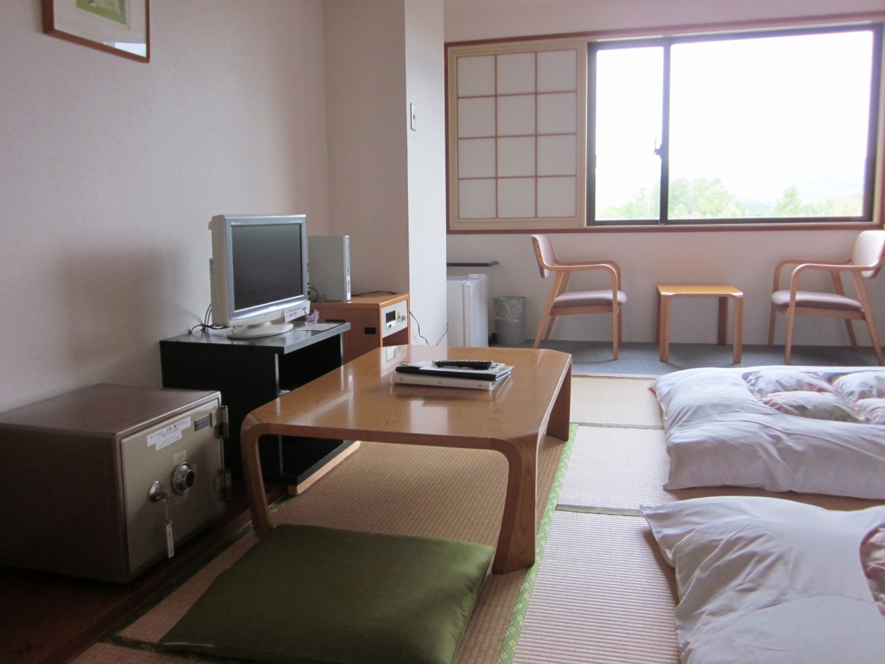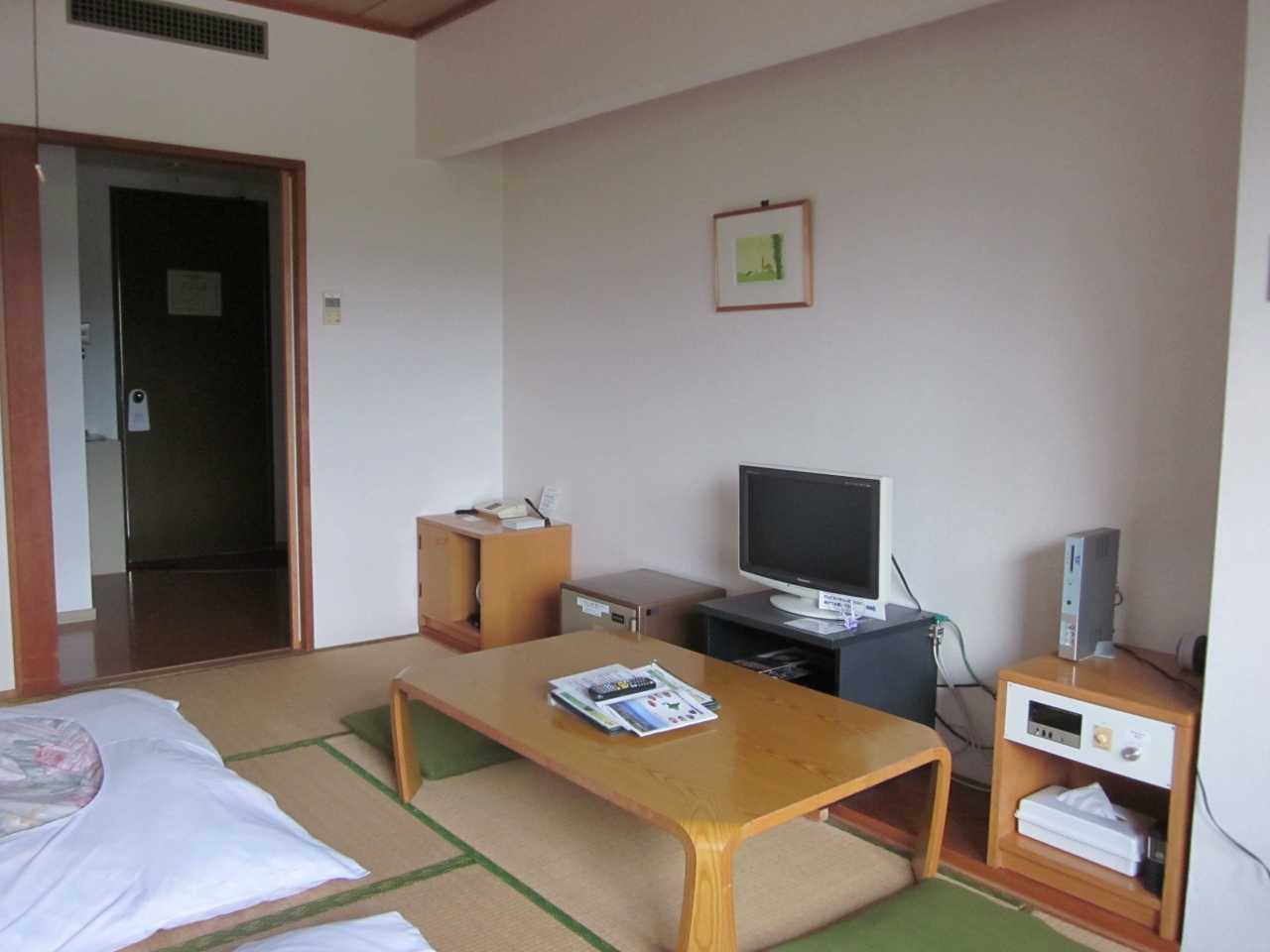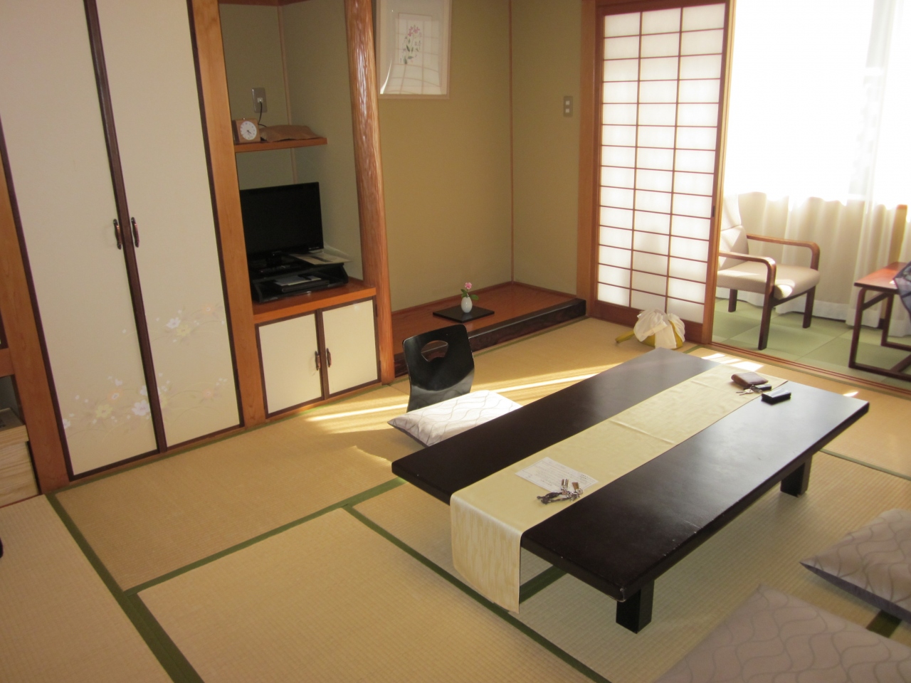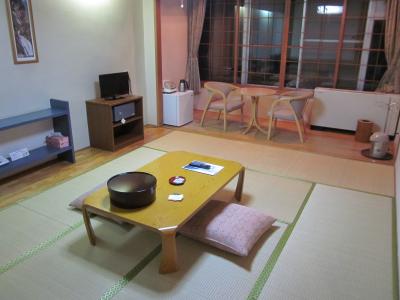 和室10畳に洗面台・トイレ・バス付きの禁煙室で、綺麗にリニューアルされているようでした。大きな窓下はフローリングで椅子とテーブル、暖房用ヒーティグもしっかり備わってました。