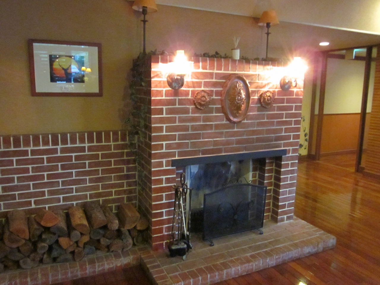 スタッフに案内されて暖炉のあるロビーで一服!~、暖かいローズテイーを頂きながらチェックインが終了。