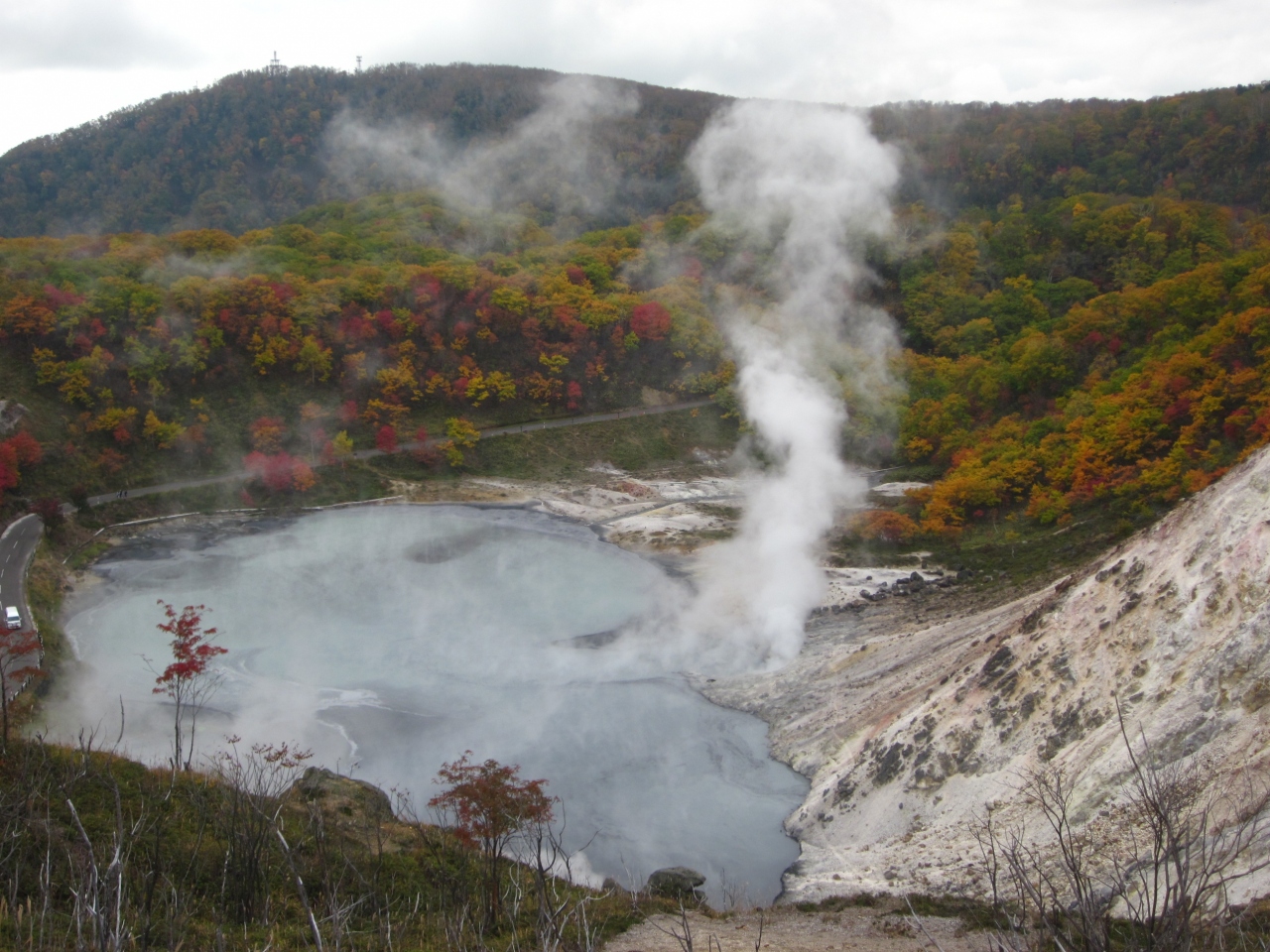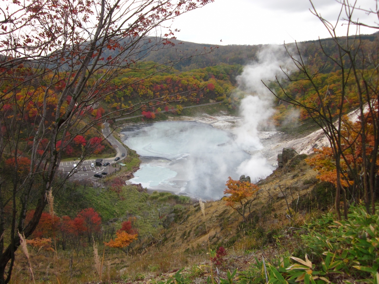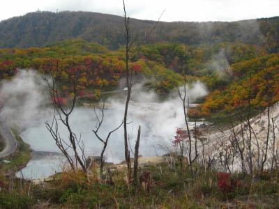 登別では絶大なる景勝地が温泉街から近い「地獄谷」~、山に囲まれた谷沿いに沿って噴気孔があり白い蒸気が上がり、泡を立てて煮えたぎる源泉の湧出によって木々が立ち枯れ岩肌が露出し、周囲一面が白い世界感に包まれ、鼻を衝く硫黄の臭いがまさに鬼の棲む地獄の由来に成っているもので、雲仙や別府などにも同様の温泉地獄が有りますね!~。