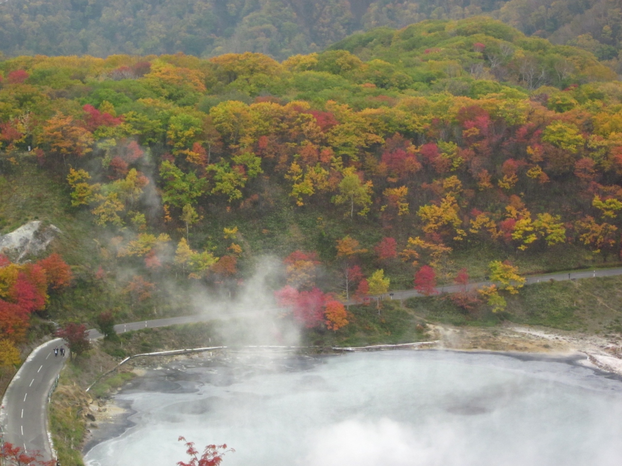 登別温泉の東2kmの位置に近い「倶多楽湖」は火山活動によって出来たカルデラ湖で、周囲標高500m前後の外輪山で形成された周囲8kmのほぼ丸い形をした湖は珍しいです。