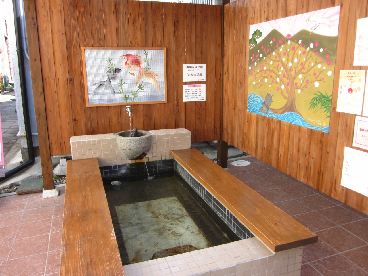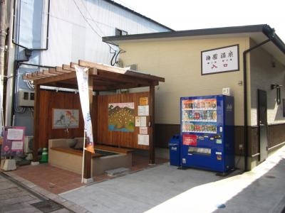 国際通りソルパセオアーケード街から梅園通り(路地)へ入って居酒屋・二十八万石の前ほどに真新しい足湯と「ジモセン・梅園温泉」が在ります。