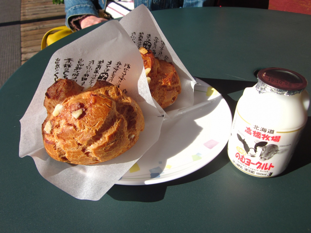 店内を見ていると他にも美味しそうなスウィーツがいっぱい!…、なので定番のシュークリーム¥190とニセコ飲むヨーグルト¥160を購入して、外のテーブルでいただきましょう!。