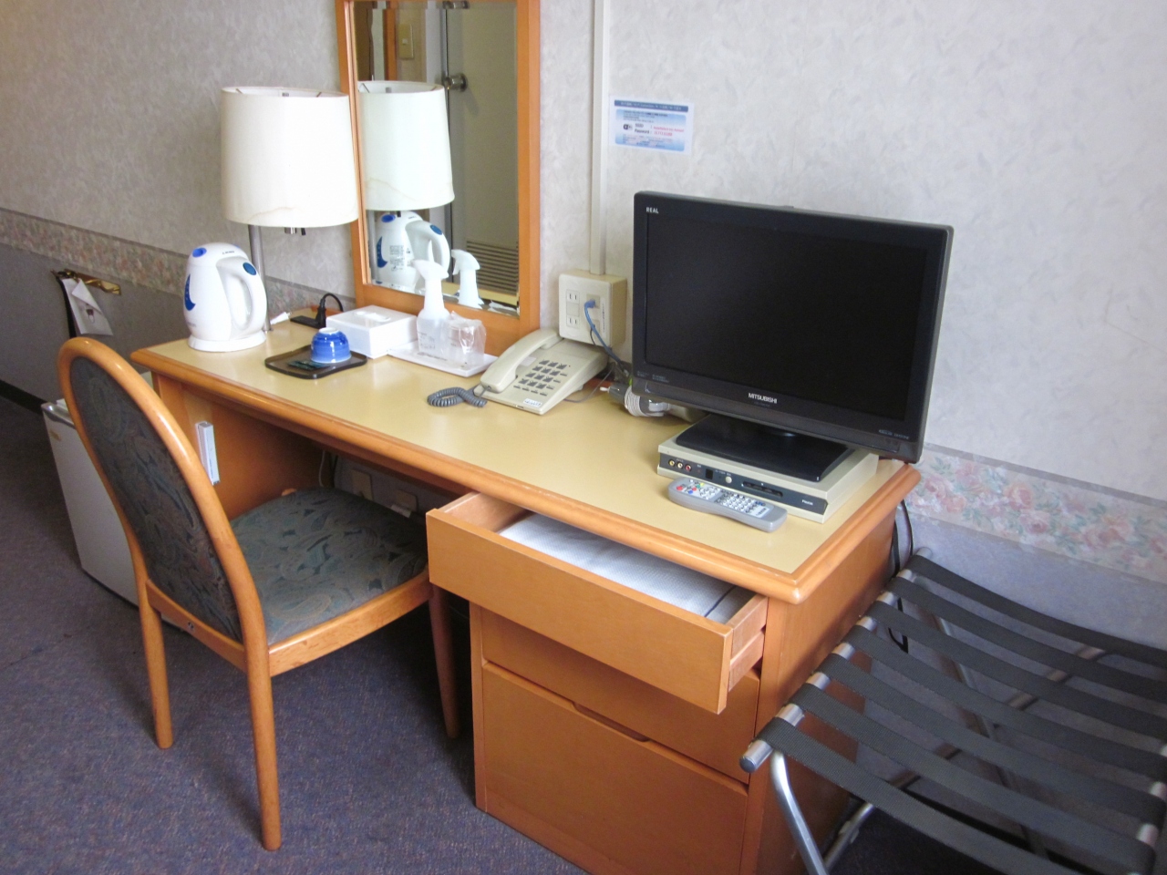 で客室なのですが、実はこれが大きな問題でして?…、造りがレイアウトがデザインがザ・昭和チックなレトロ感覚とかではなくて~、カーペットや壁紙や天井の隅が破れ・剥がれ・擦り切れなどが余りにも激しく放置されたまま?…、窓の引き戸を閉めると壁や窓枠に黒黴がびっしりと発生する酷い有様でただただ茫然でした!?…。