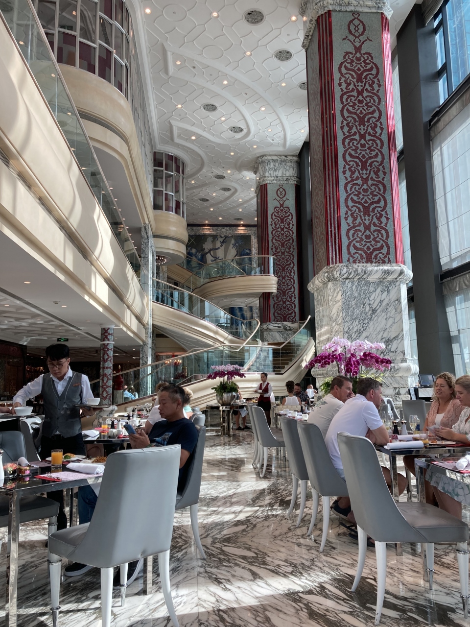 最初は、建物・インテリアの派手さ豪華さだけで、6つ星と噂されているのかと思っていたが、今回泊まって見て、それは大きな間違いだと認識した。ハードだけでなく、スタッフの質・ホスピタリティは最高レベル。その上、食べ物は素材自体も新鮮で高品質。朝食会場も豪華。連泊すると、優秀なスタッフは私たちの好みを覚えていて、言わなくとも、自分から言って確認してくれる。うれしい感動もののホスピタリティ。スタッフはテーブルの様子を常にチェック。お皿が空になるとすぐ取り換えるし、ナイフ・フォークも常に新しいのをテーブルへ。デナーでは当たり前のこのようなサービスを、朝食から緊張せずに受けられる気配りには感動しました。ここのホテルすごい!毎日、気持ちの良い一日のスタートが切れました。