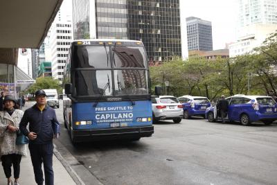 キャピラノ渓谷ヘ行く無料バス(シャトルバス)は、ホテルの横(裏側の出口)から出発します。また、ウイルシャー行きのバスも、このホテルから出発するので、大変便利。地下鉄の駅もすぐ隣にありました。 スーパーマーケットもリカーショップも徒歩圏。美味しいレストランも、近くに無数と言っていい程、たくさんあります。