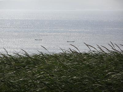 岬までの途中の道、金田の岬方面に目を向けると朝日がキラキラ水面に反射して、またウニ漁の船も見えて、礼文の風景だなーと思いました。