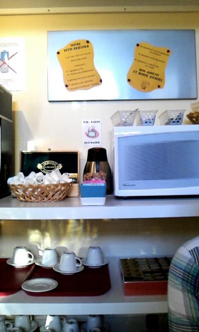 朝食(7時~12時)は、ホテルの入口に入ってってすぐ右手のロビー手前の小さな部屋で取れます。クロワッサン(と言われたけど小さなバターロールっぽかった)、ベーグル(フェアモントベーグルのものらしい)、マフィンなどが食べられます。種類は多くないですが、いちおう食べ放題らしいです。飲み物はセルフサービスでしたが、食べ物はウェイターっぽいお兄さんが注文を聞いて別の部屋から持ってきてくれました。