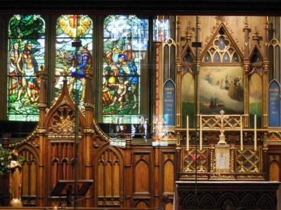 ガイドのお話は、モントリオールの歴史、街の発展にこの教会がとても重要な役割を果たしていたことが中心です。ステンドグラスにもそれが表現されています。最後に奥の小さな(といっても300人くらいは入れるらしい)チャペルに行って終了、全部で30分ほどです。以前訪れた際、「ここで結婚式を挙げるのに2年待ち」と聞いた気がしたのですが、今回改めて聞いてみると「そんなことないわよー」。年間200組ほどの結婚式があるそうです。