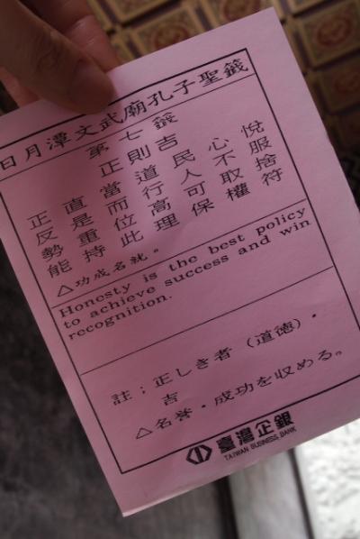 奥の孔子廟の方にあるおみくじは無料で、台湾式作法を体験できます。おみくじに書いてあることはとても簡素ですが、英語と日本語訳も併記されているので、意味はだいたい理解できると思います。