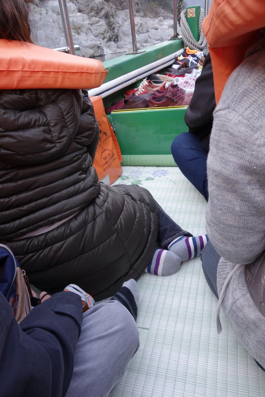 1度に3・4隻ほどが運行していて、1隻40人程度乗れるようです。椅子はなく入口で靴を脱いで呉座の上にそのまま座ります。足が悪い人は不向きかな。