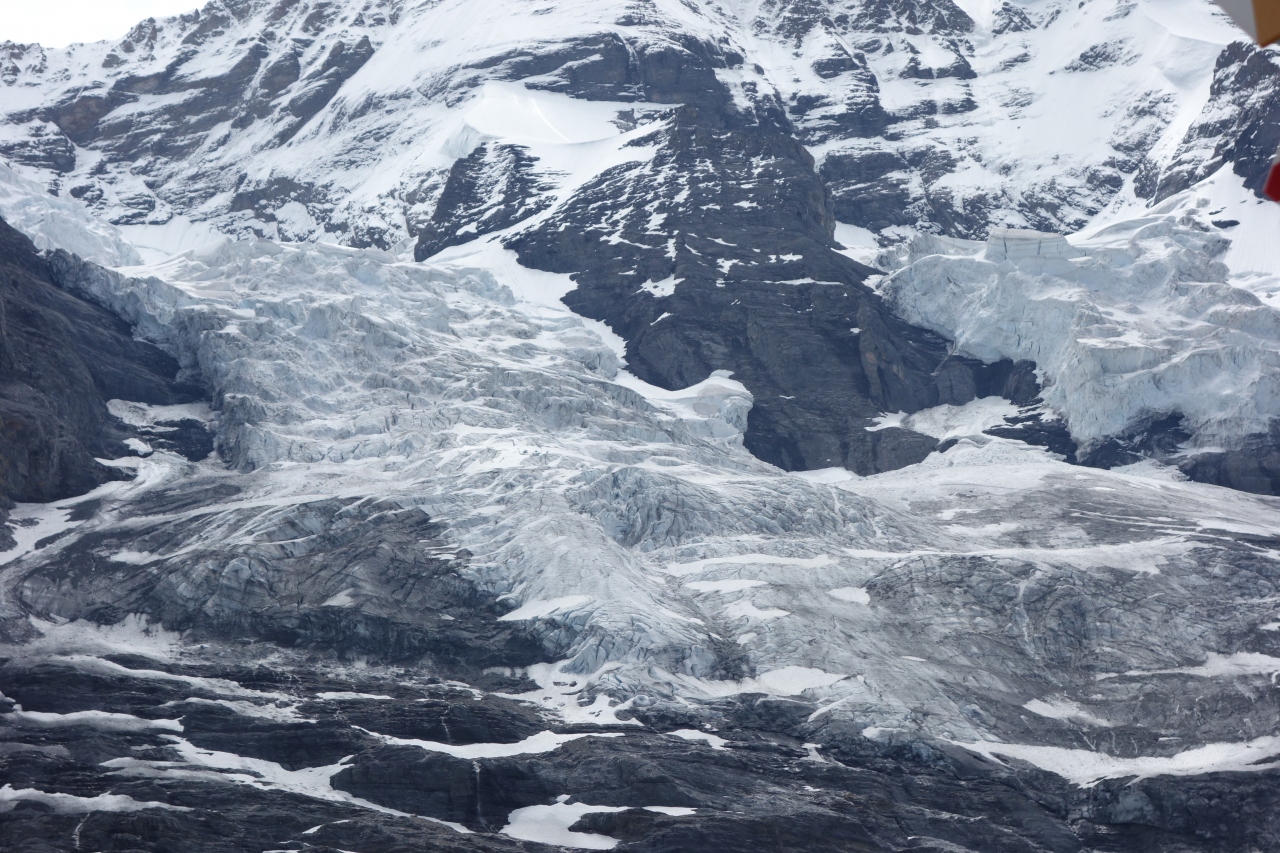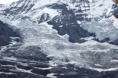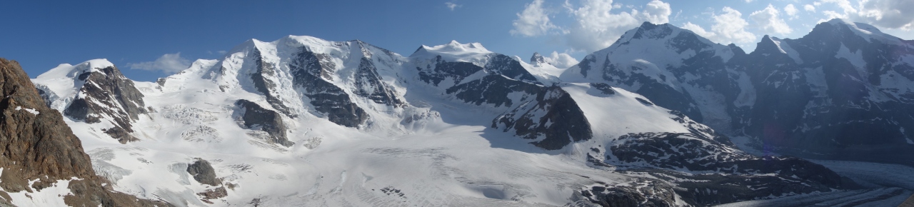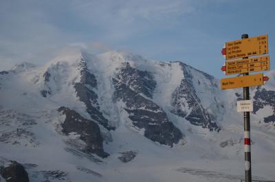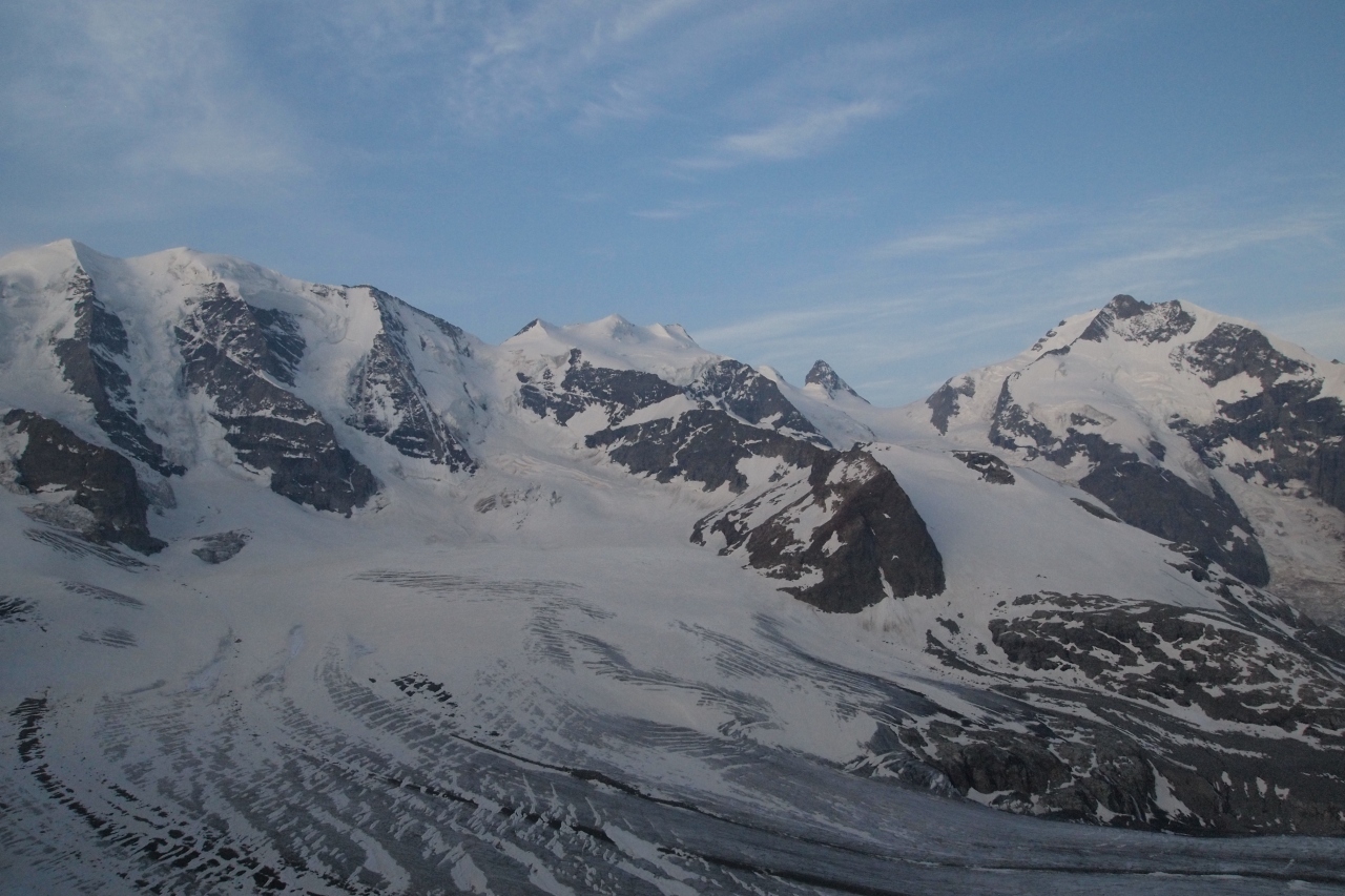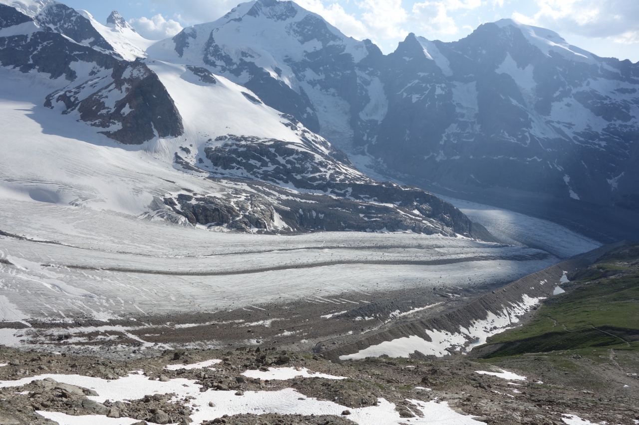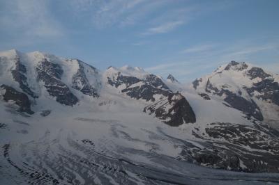 展望台から左手に見える大きな山がPiz Paluで、そこから流れる氷河が眼前を横切っています。右手にも氷河が流れている山があり、そちらがPiz Berninaです。2つの氷河が合流するところまで見えました。合流したのがMorteratch(モルテラッチ)氷河です。