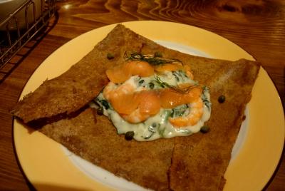 早めのランチにいただいたのはブルトンヌというスモークサーモンのガレット。サーモンには鉄板のディルやケイパーが添えられていて本格的。ホワイトソースと和えられたほうれん草ともよくマッチしておいしかったです。